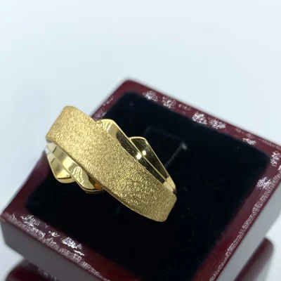 انگشتر “نوربافت” با طراحی طلایی و بافت منحنی‌اش، نمادی از درخشش و حرکت مدرنه. این حلقه با خطوط نرم و