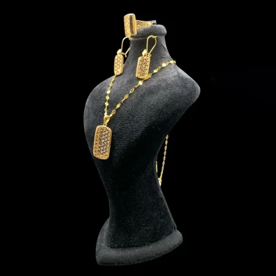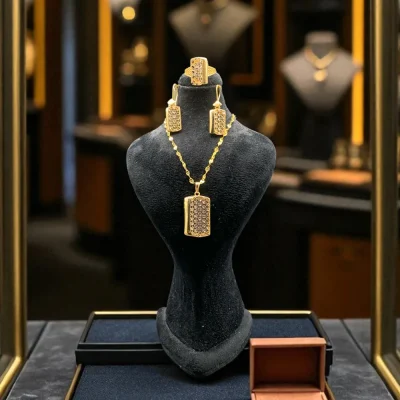 نیم‌ست طلای ماکان با طراحی ظریف و آینه‌ای طلایی، ترکیبی از گردنبند، گوشواره میخی و انگشتر را ارائه می‌دهد که