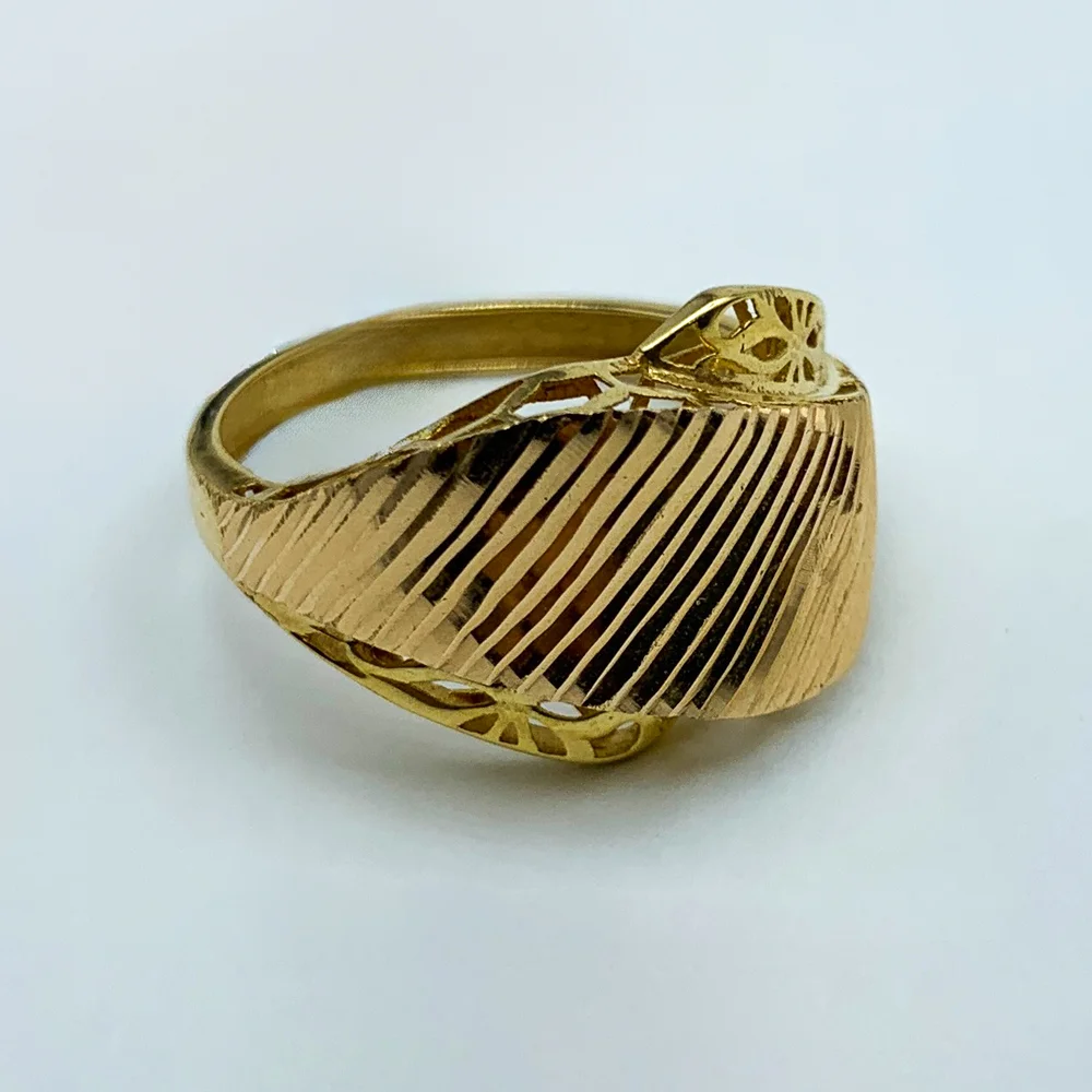 انگشتر اصالت بیش از یک قطعه طلاست؛ این جواهر، تندیس کوچکی از شکوه گذشته است که با هنرمندی امروز بازآفرینی شده. طراحی پهن و برجسته آن، نمادی از صلابت و قدرت است، در حالی که تراشهای مورب و منظم روی سطح آن، درخشش طلای ناب را به رقص نور تبدیل میکند.