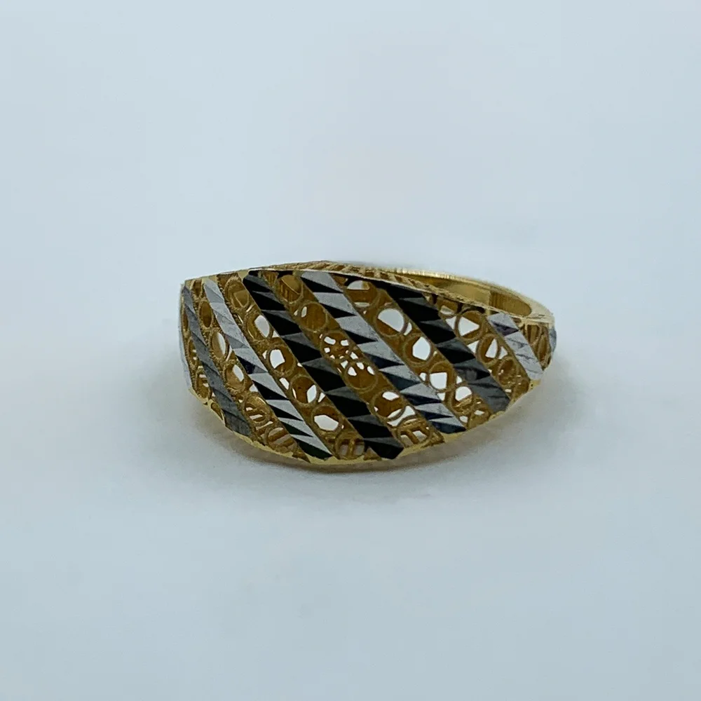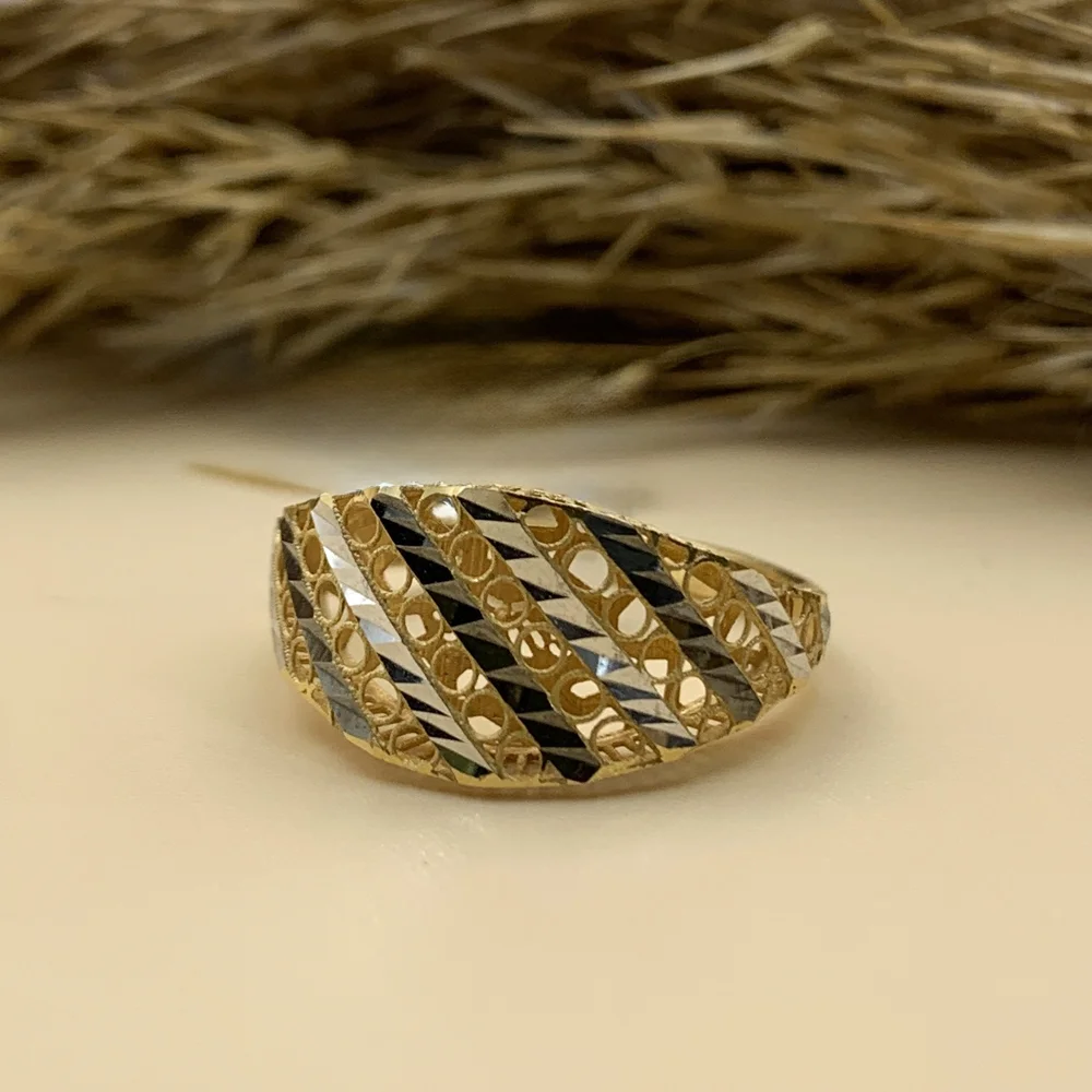 انگشتر “نواری” جواهری مدرن است که با استفاده هوشمندانه از خطوط و بافت، جلوهای پویا و چشمنواز ایجاد کرده است. این انگشتر پهن، با نوارهای مورب و موازی از طلا که به صورت متناوب براق و مات (یا زرد و سفید) کار شدهاند، حسی از سرعت، حرکت و معماری مدرن را القا میکند.