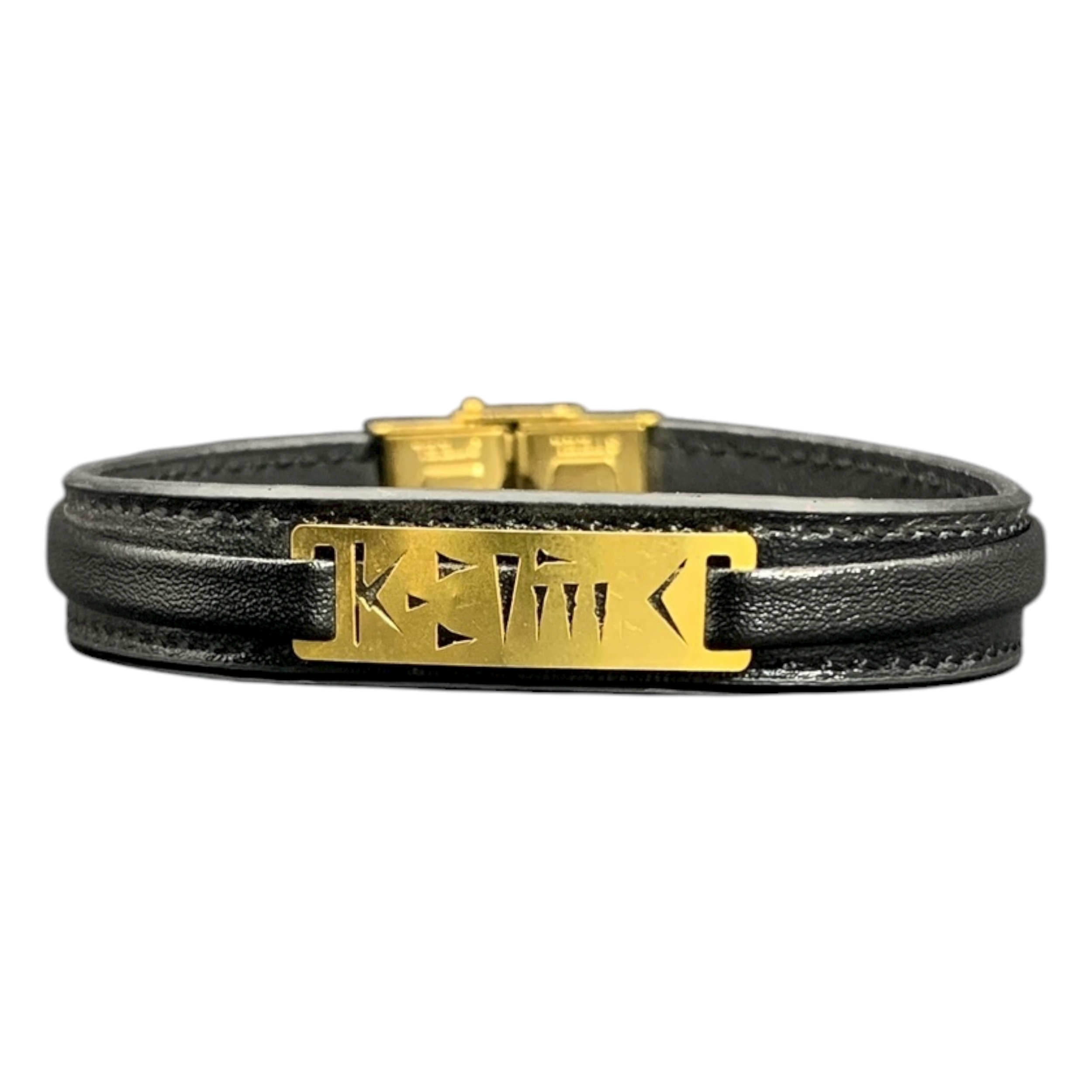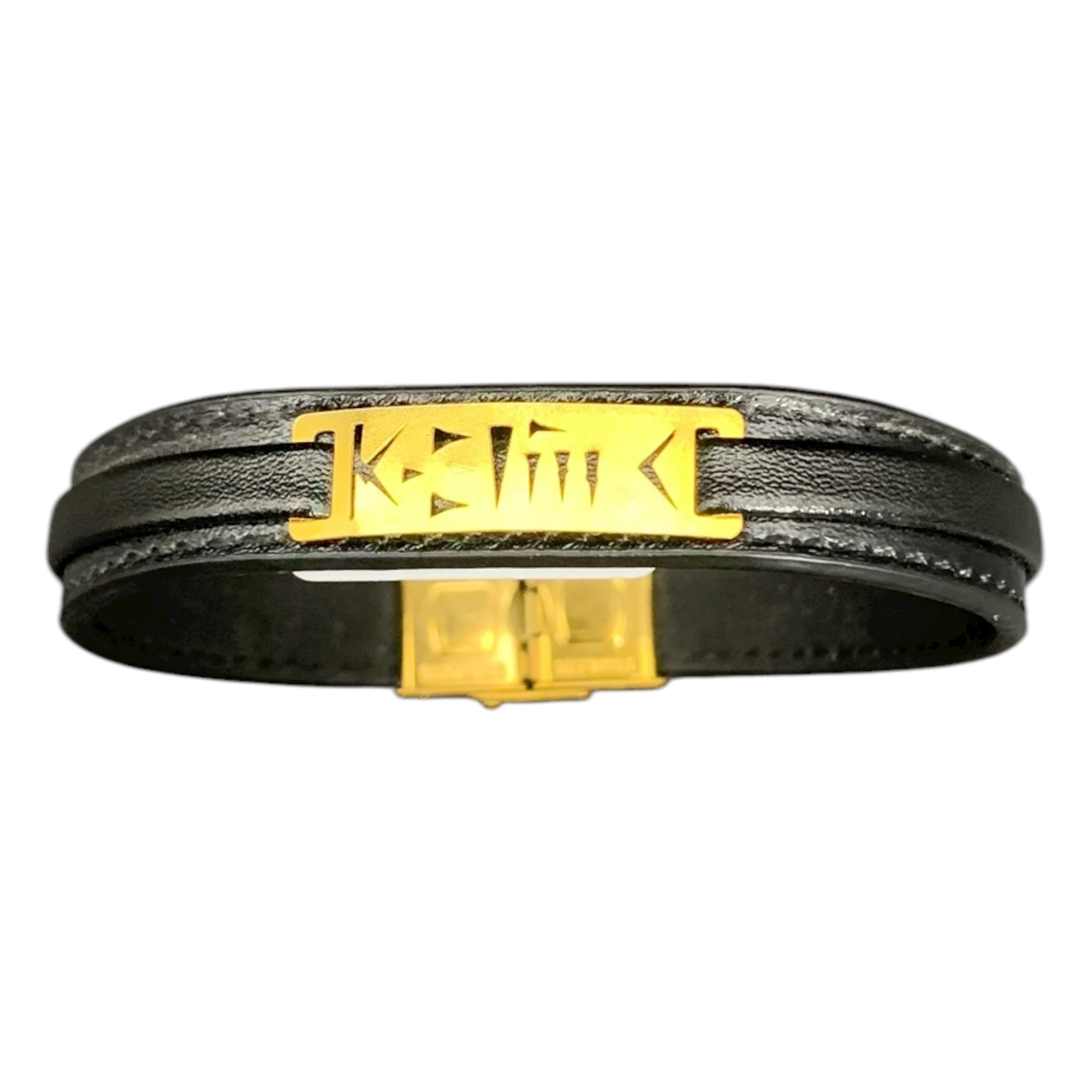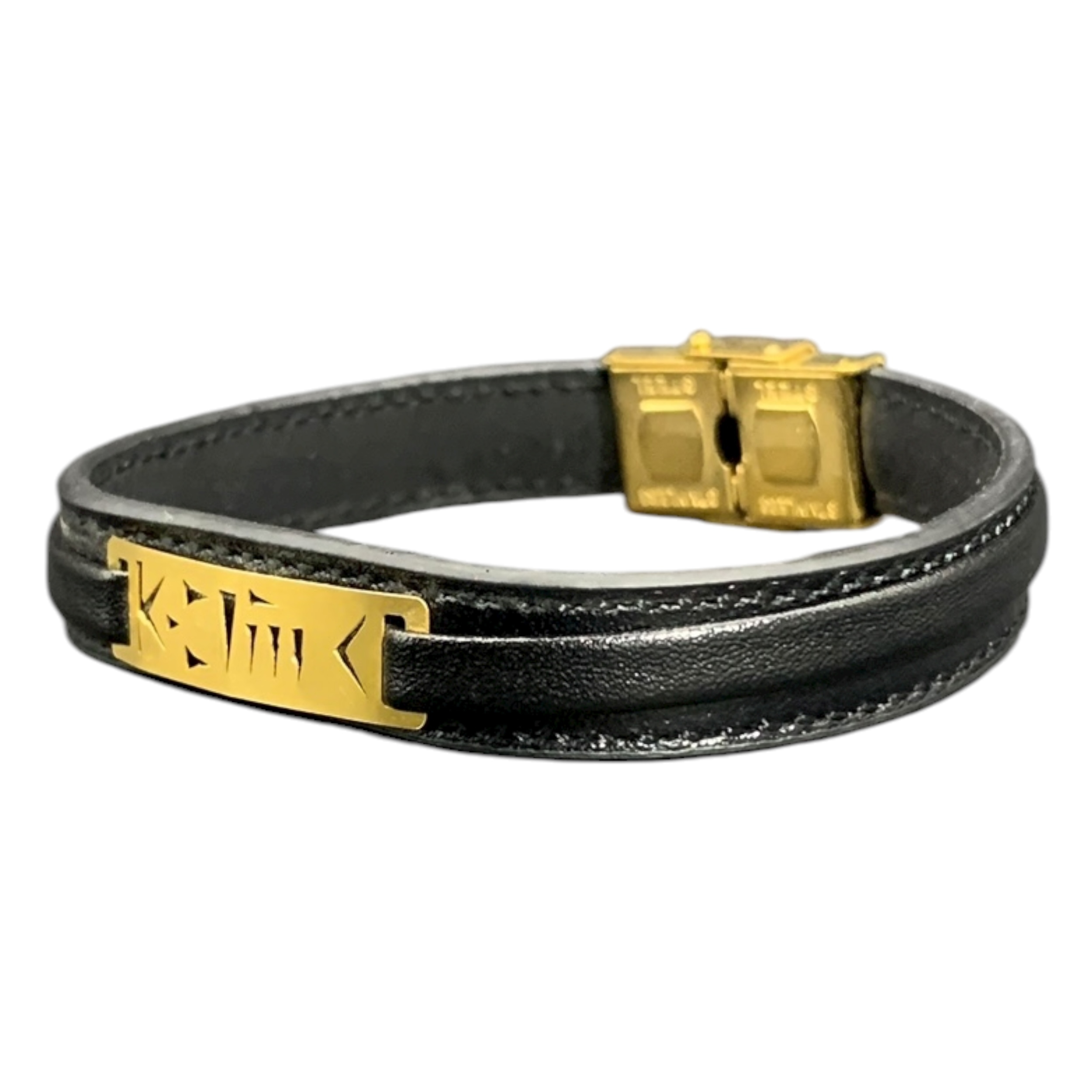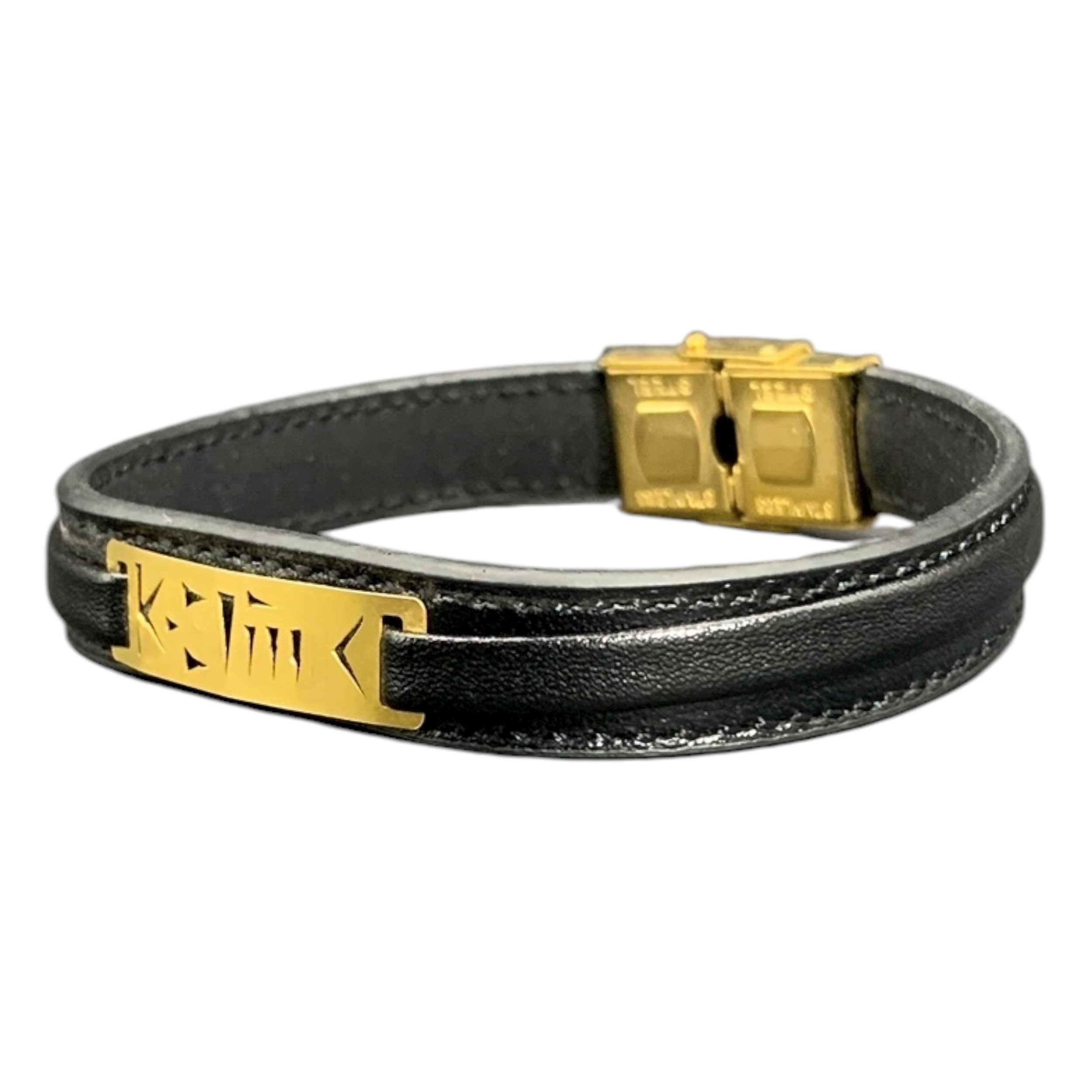 دستبند چرم مشکی طرح طلایی دو مهرهای