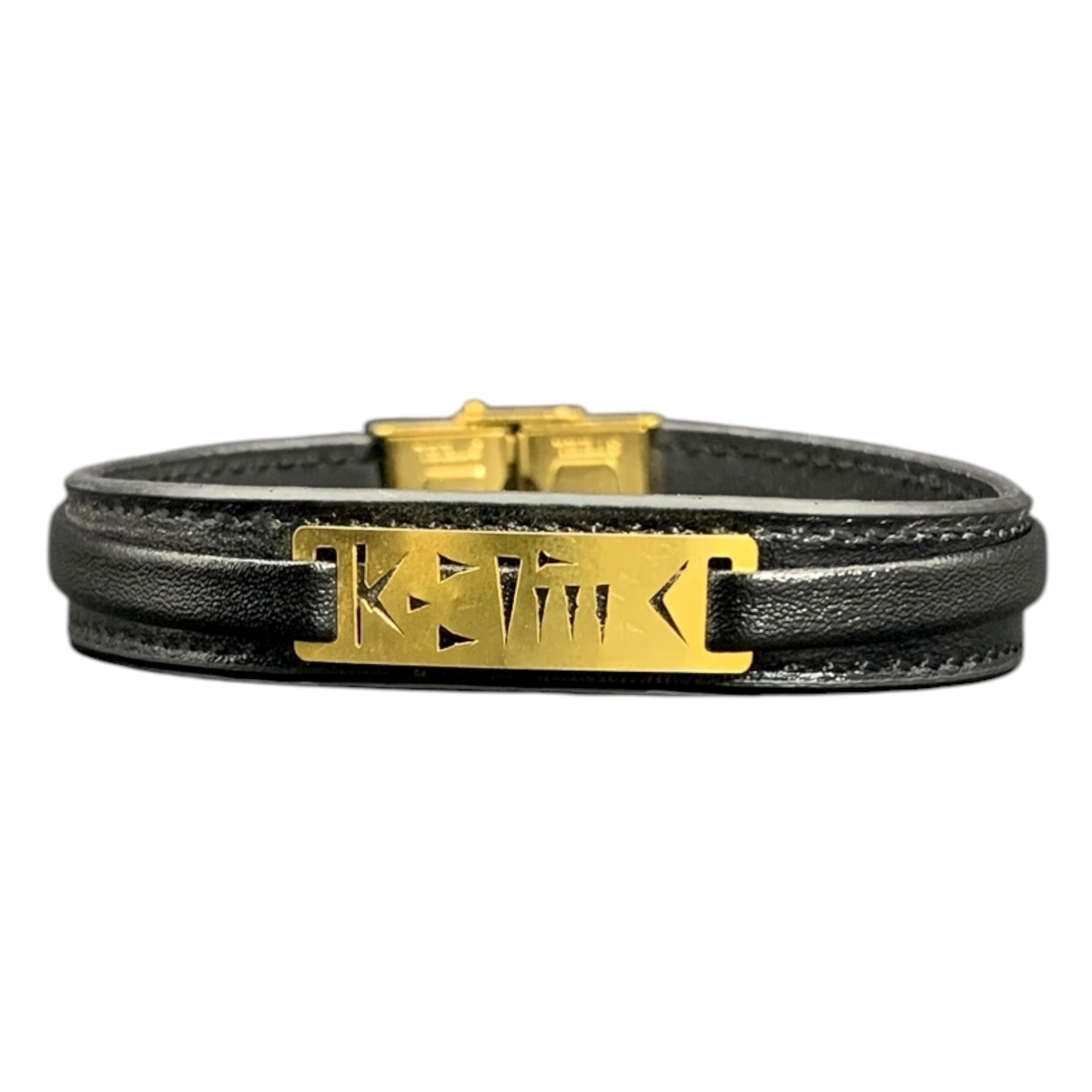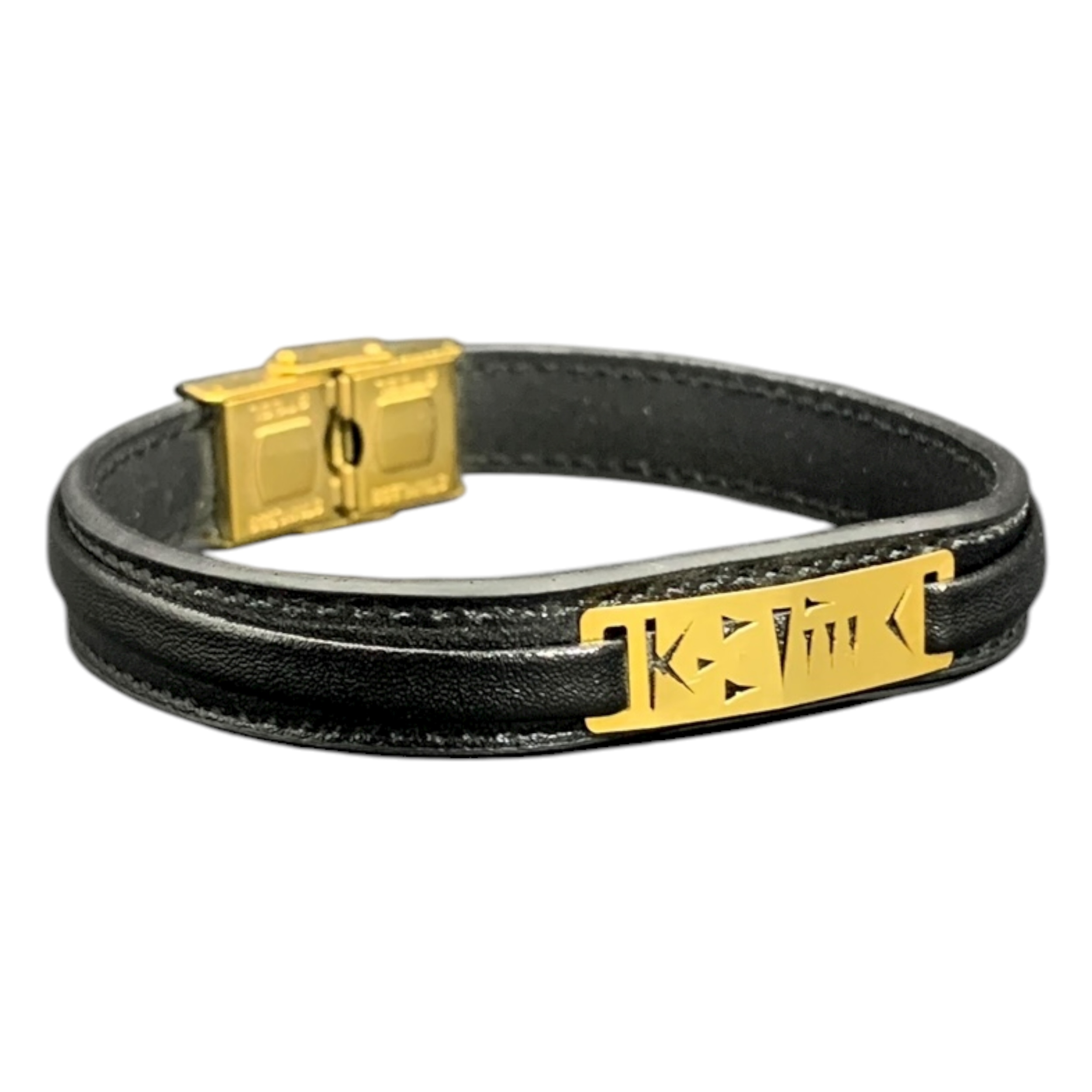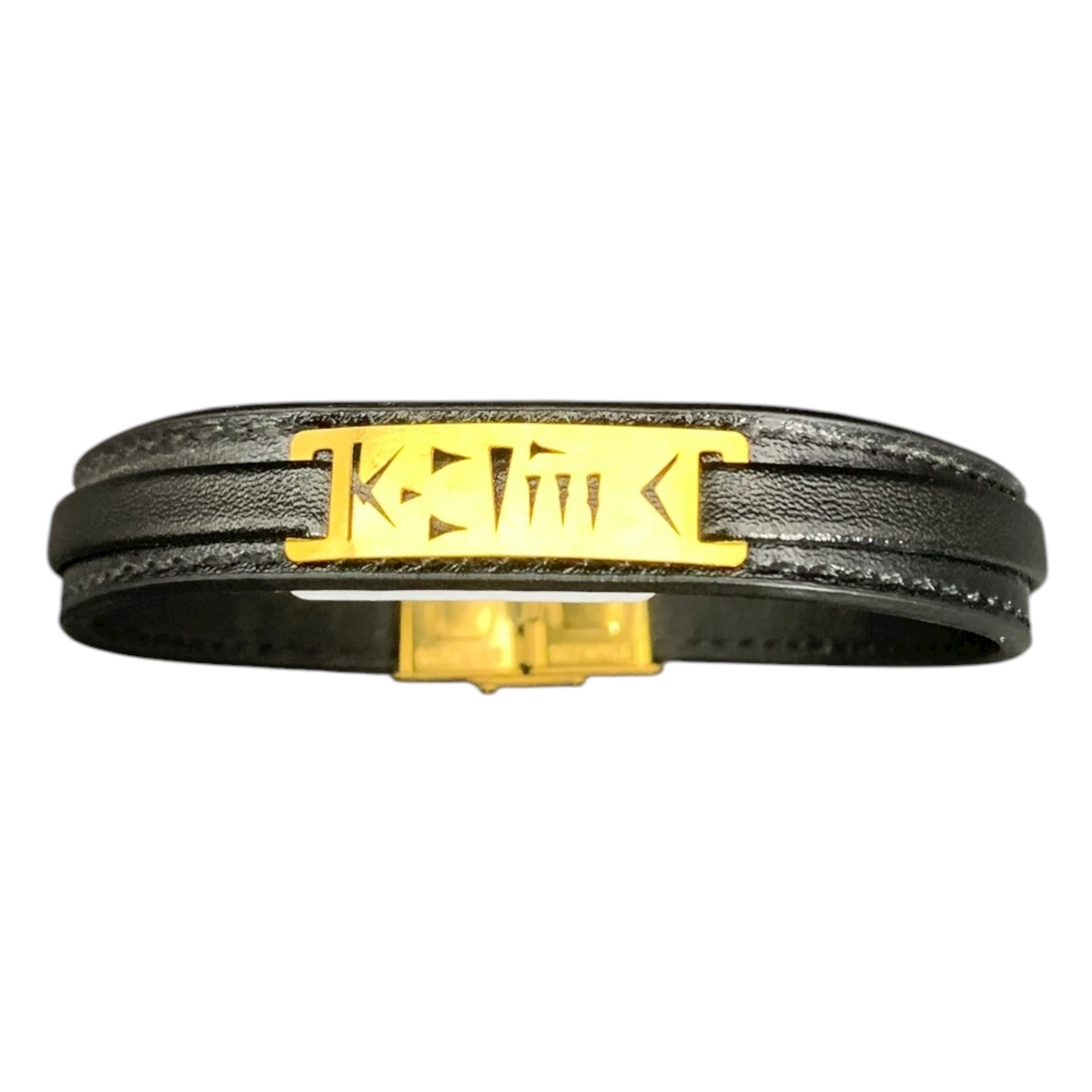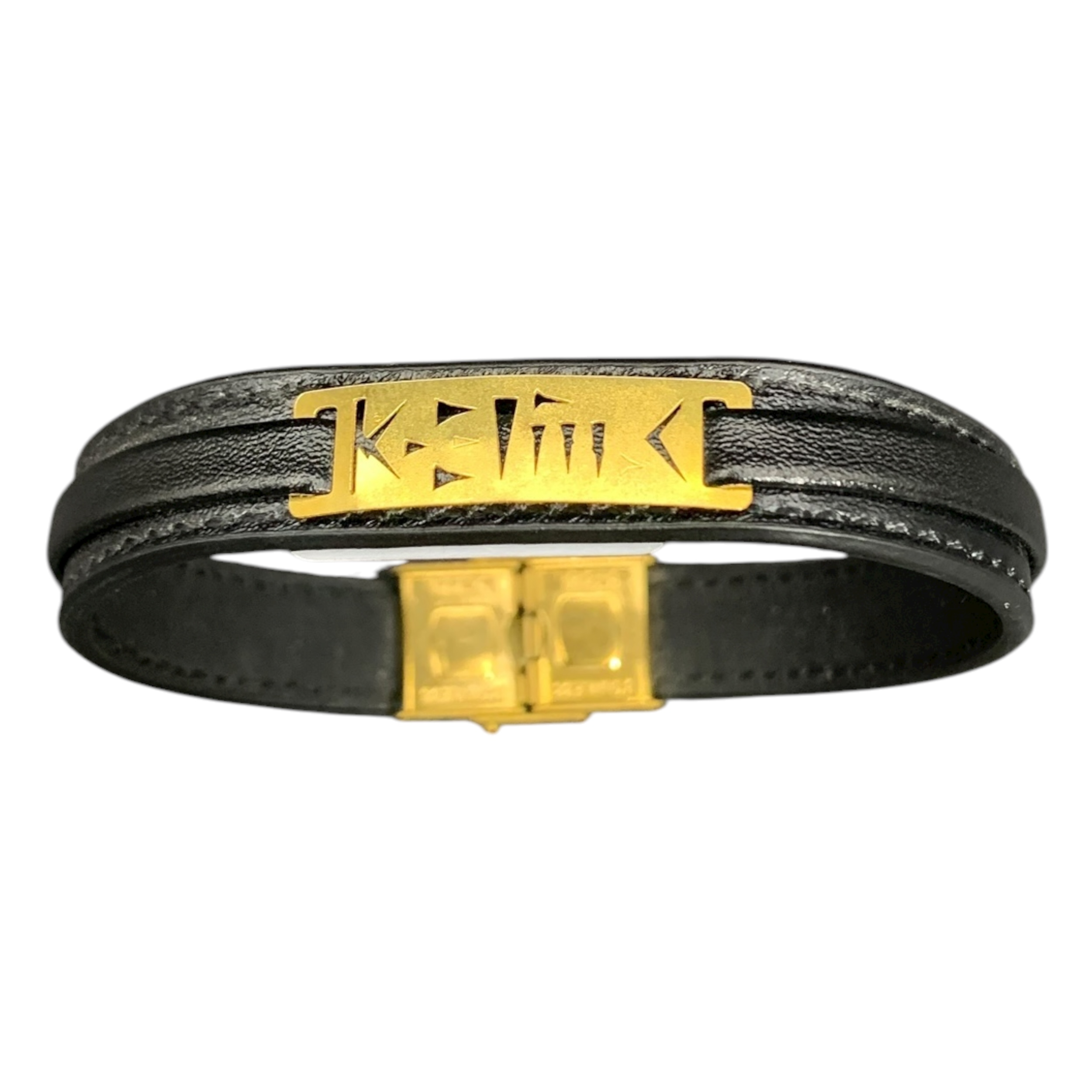 دستبند چرم مشکی طرح طلایی دو مهرهای