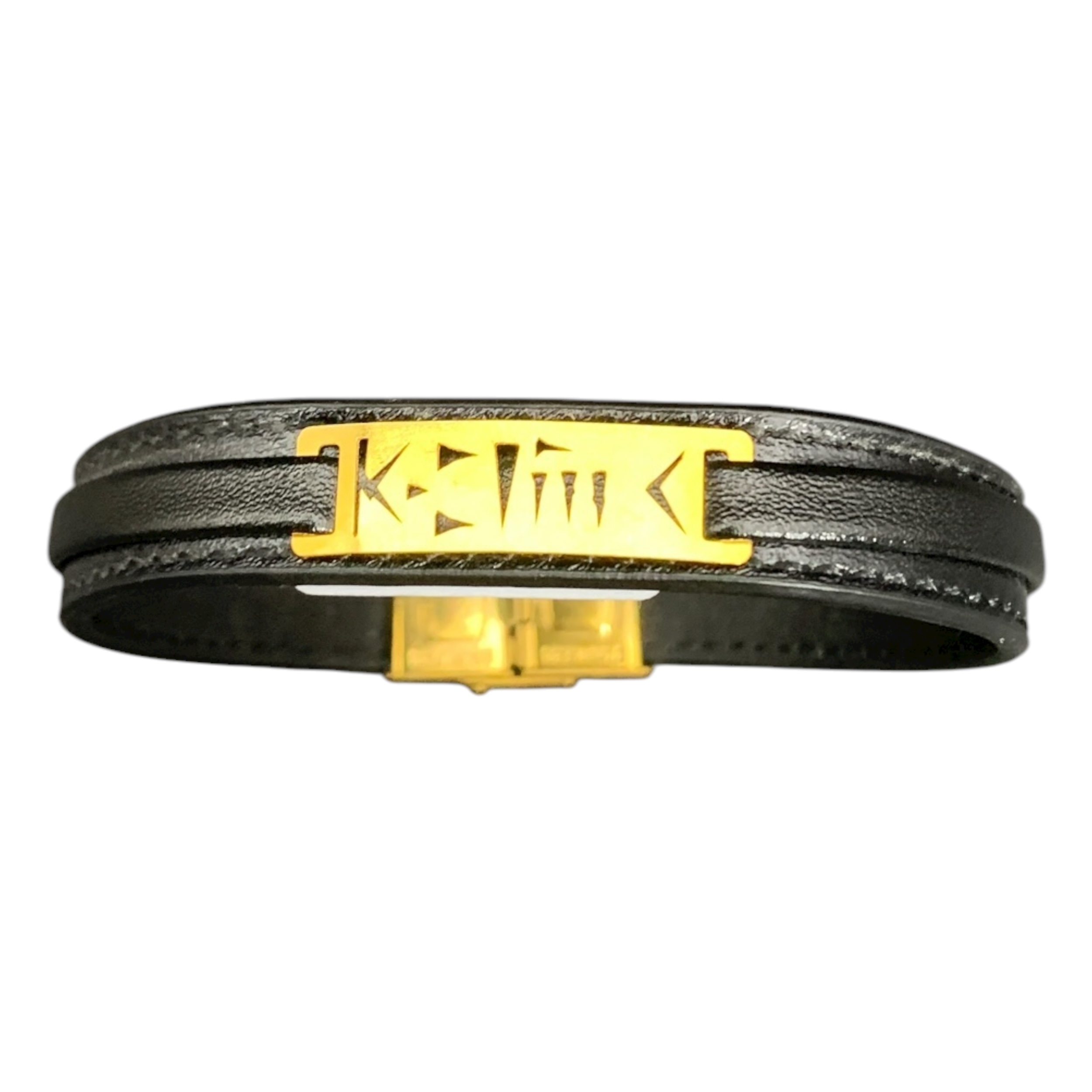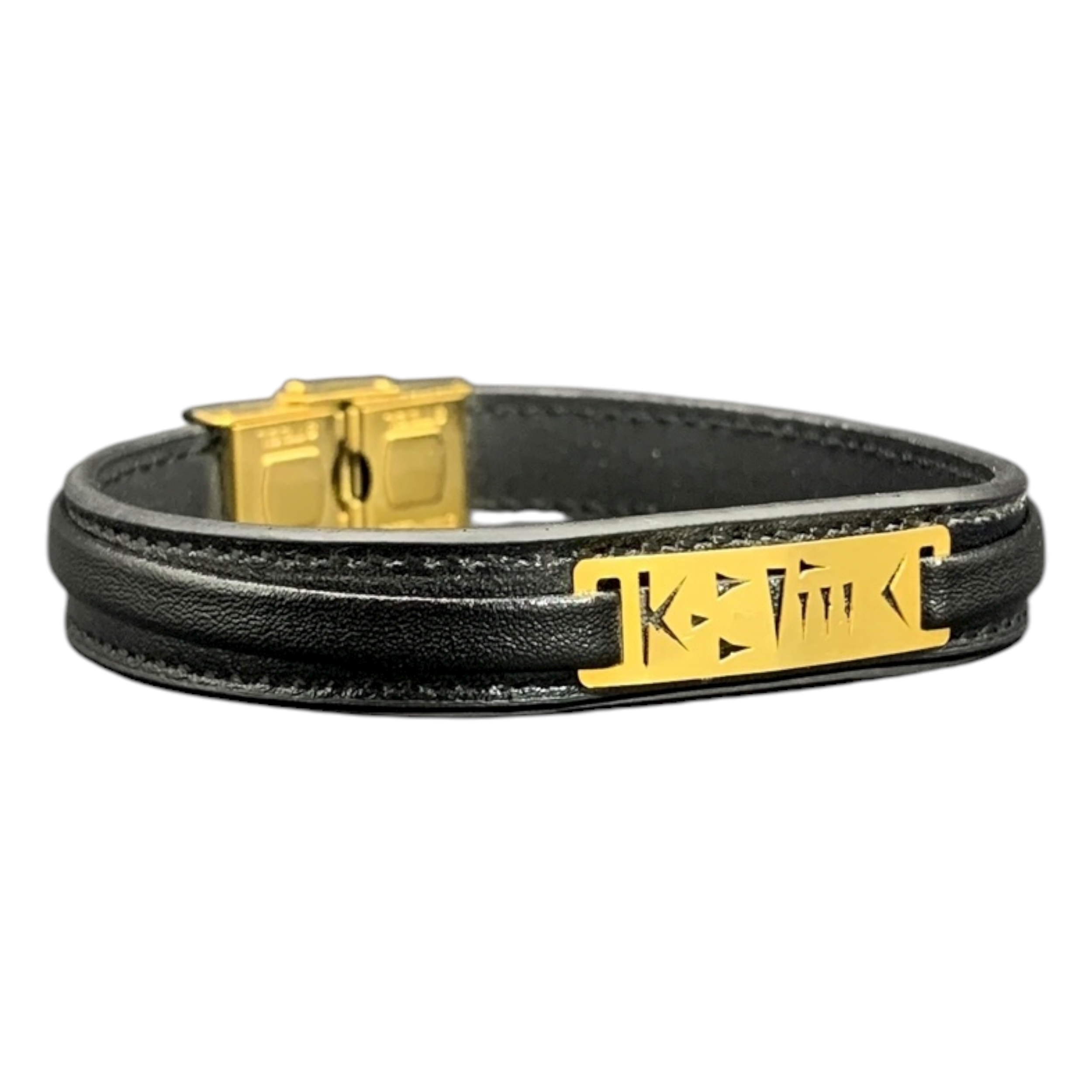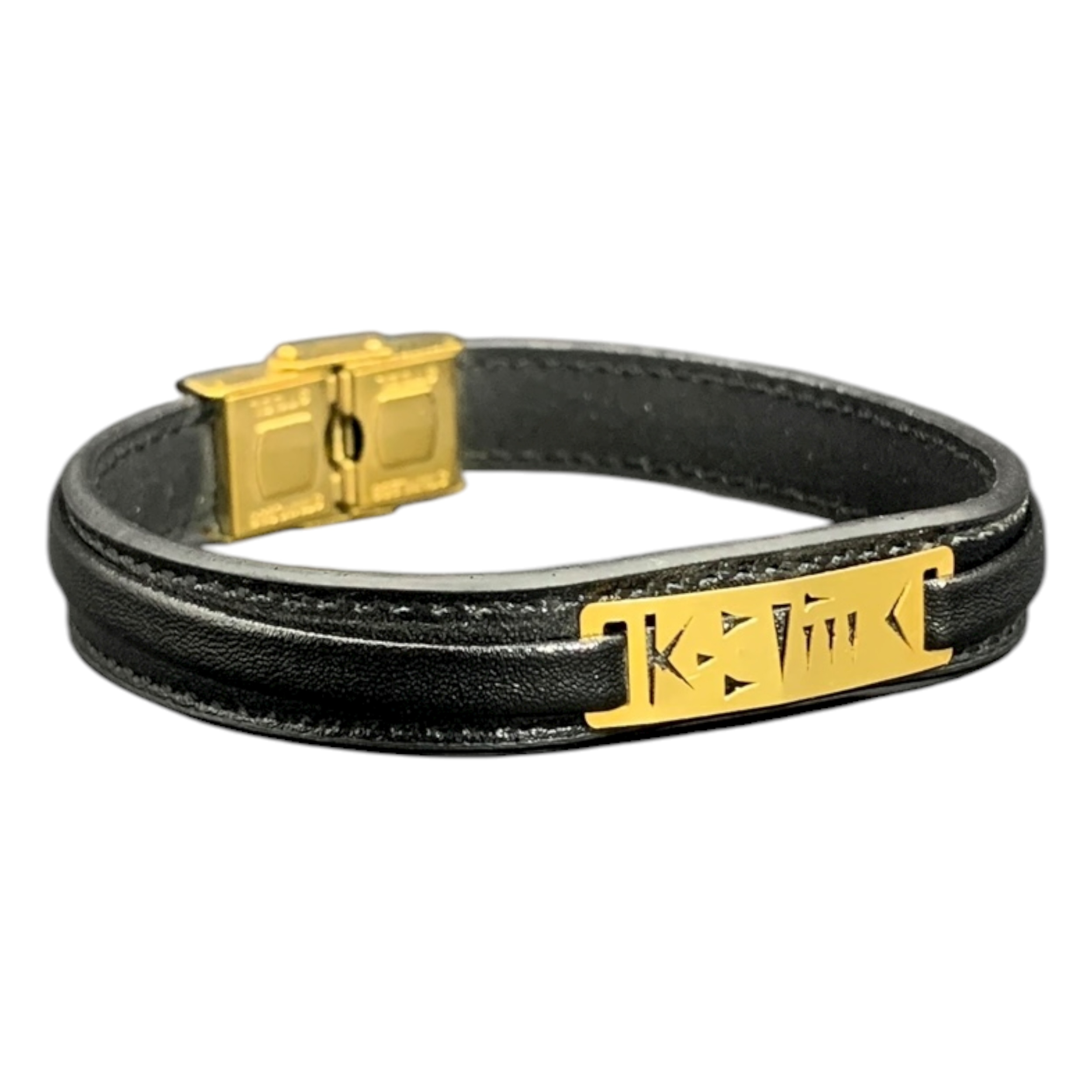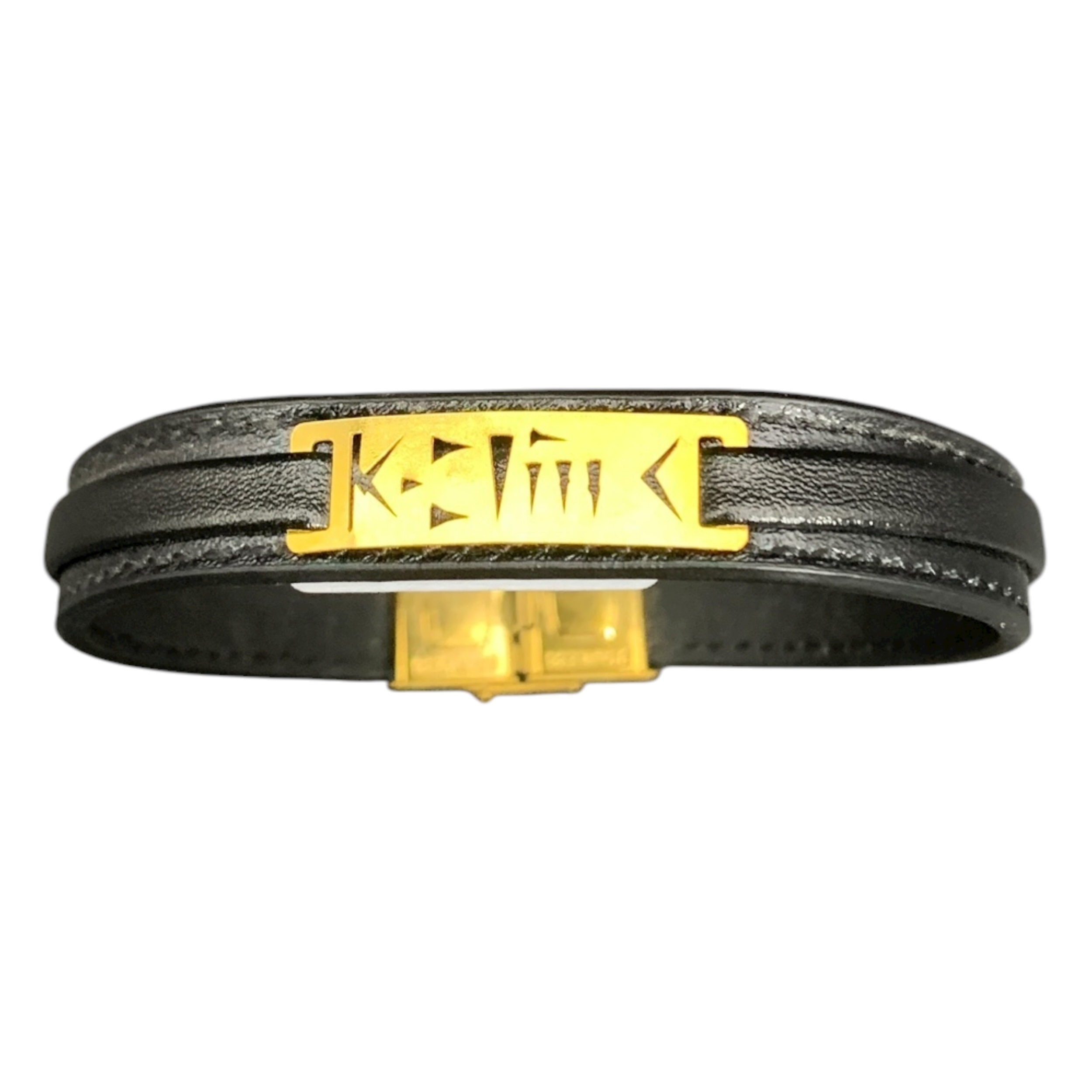 پلاک طلایی با نقوش هندسی و برشهای مثلثی ظریف روی بند چرمی مشکی، جلوهای قدرتمند اما ظریف به استایل شما میدهد.