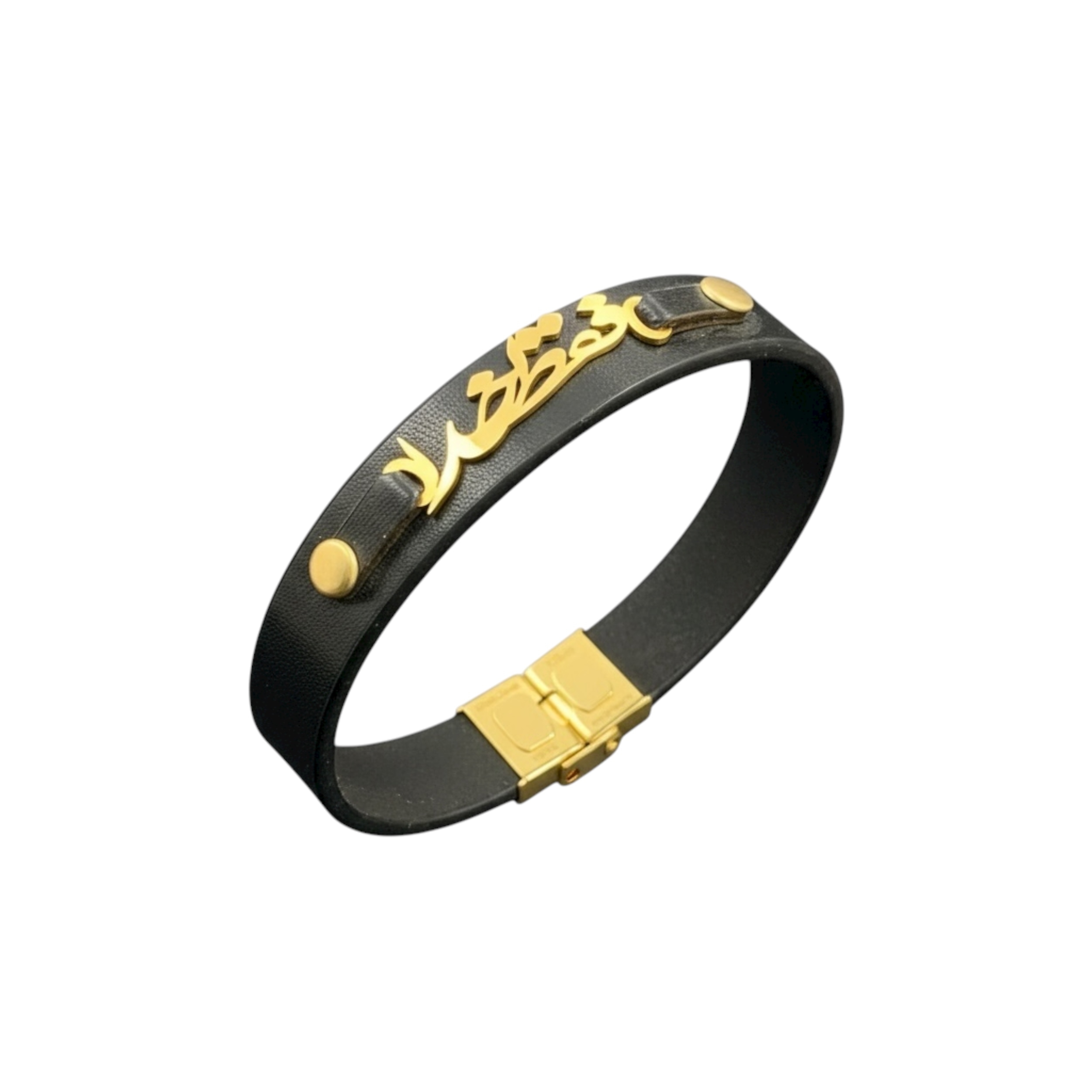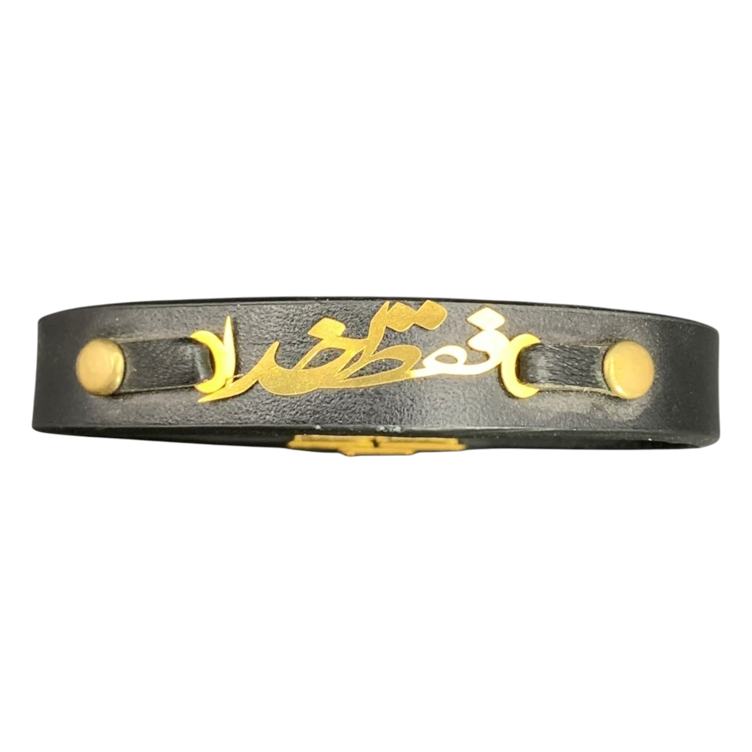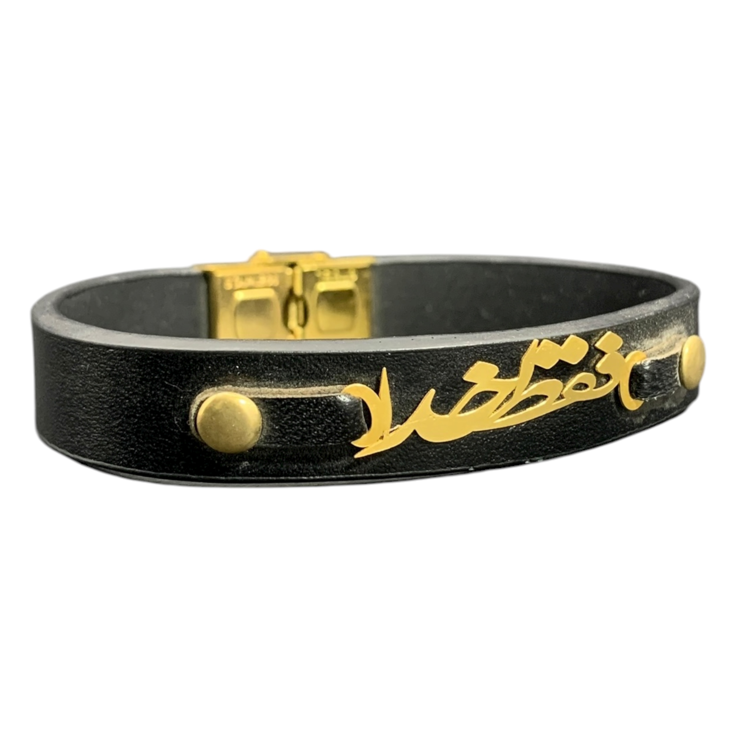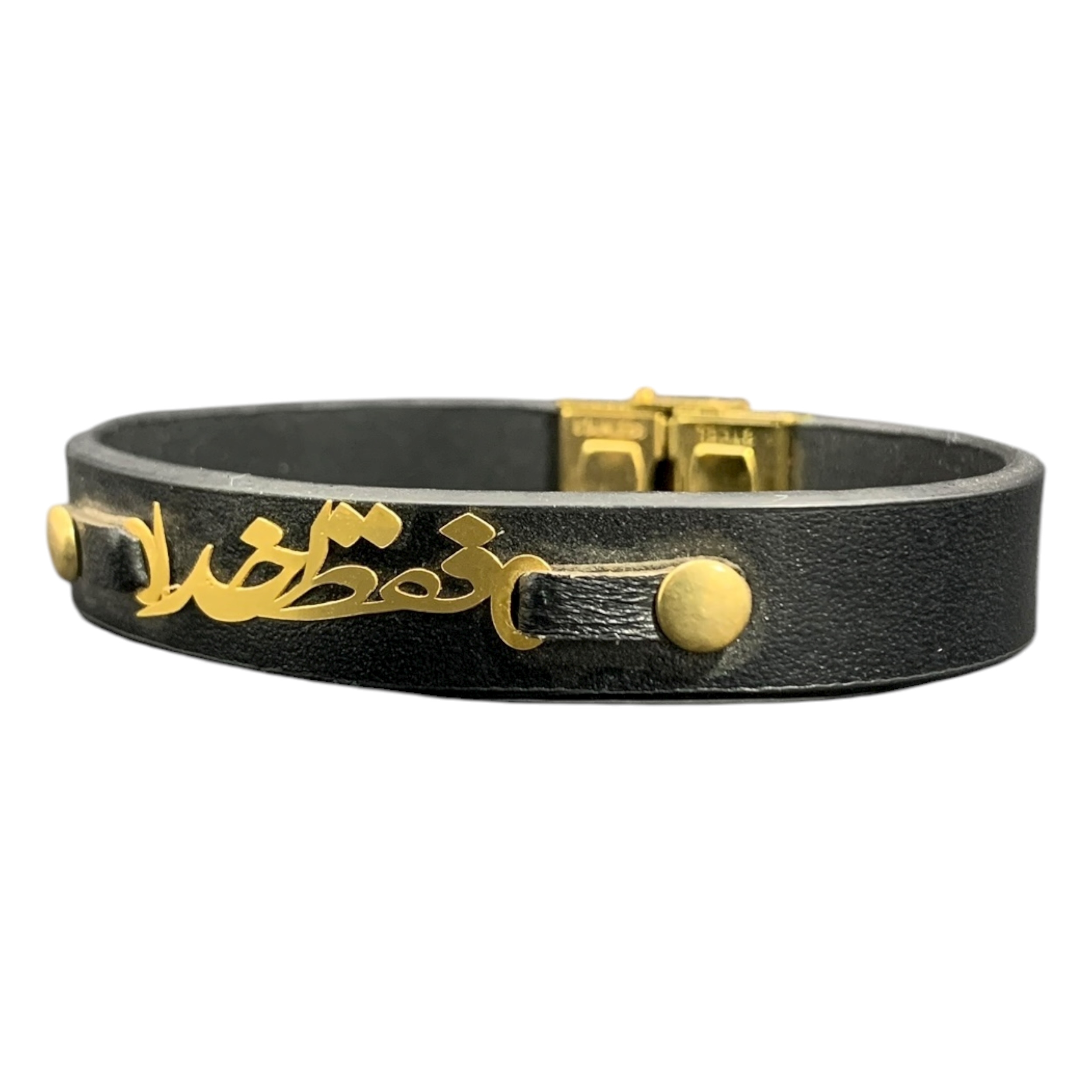 این دستبند با پلاک طلایی نوشتار فارسی “فقط خدا” بر روی بند چرمی مشکی، جلوهای خاص و معنوی دارد.