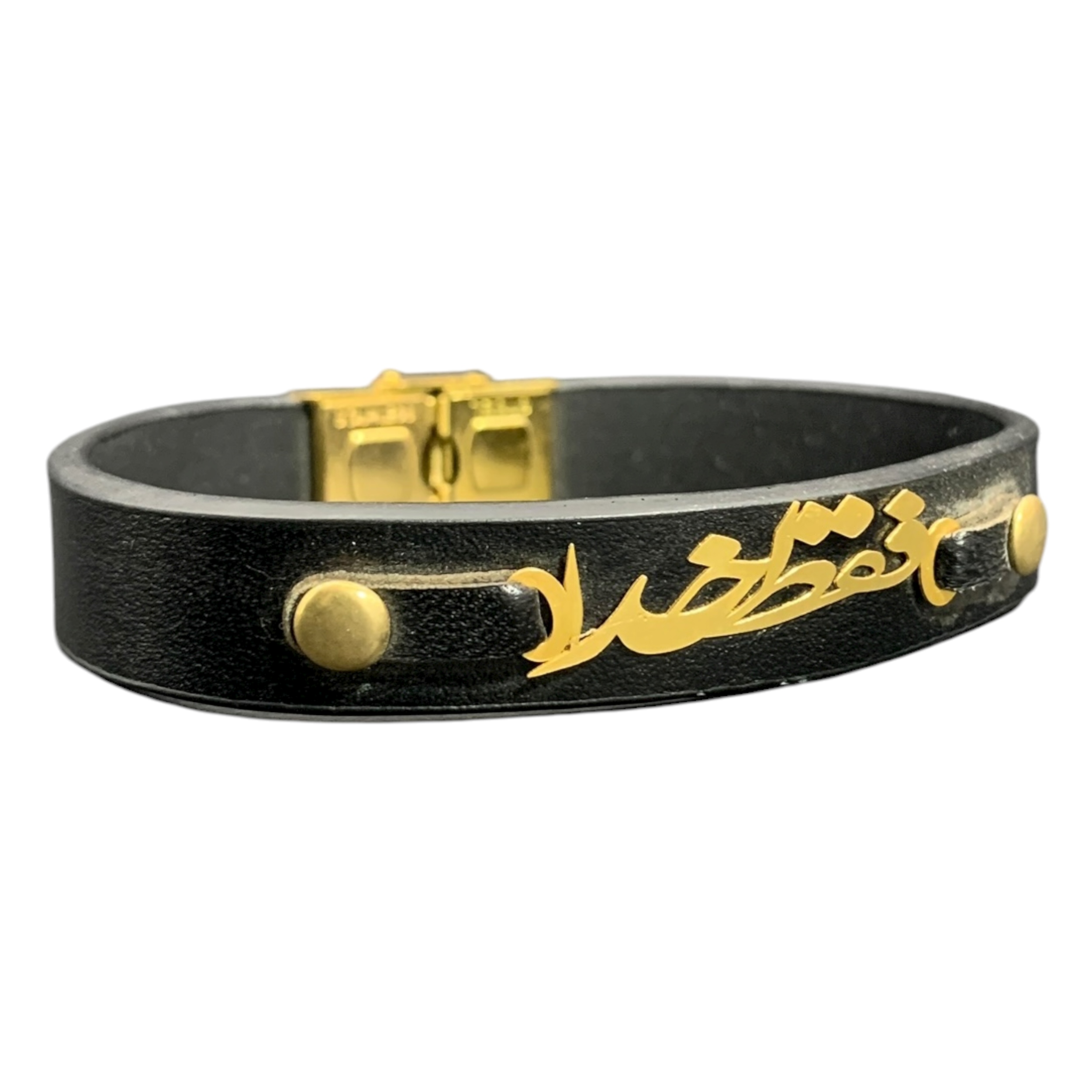 دستبند چرم مشکی با پلاک طلایی «فقط خدا»، ترکیبی از معنویت و زیبایی مدرن — مناسب استایلهای ساده و خاص بانوان و آقایان.