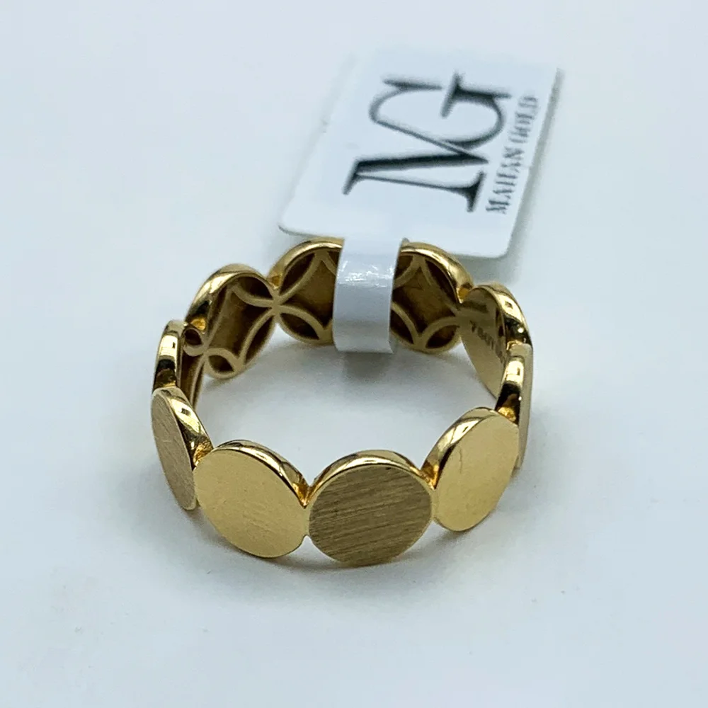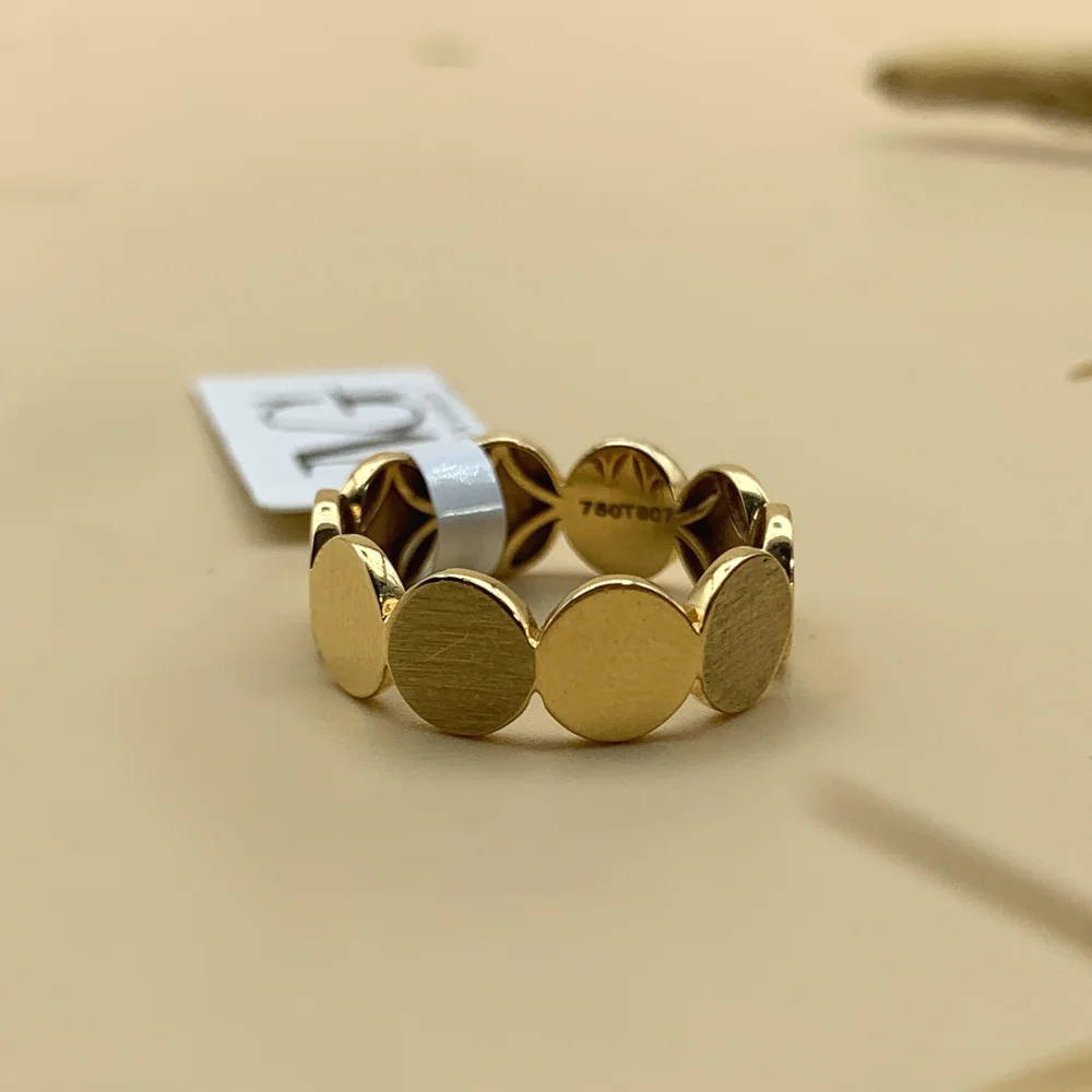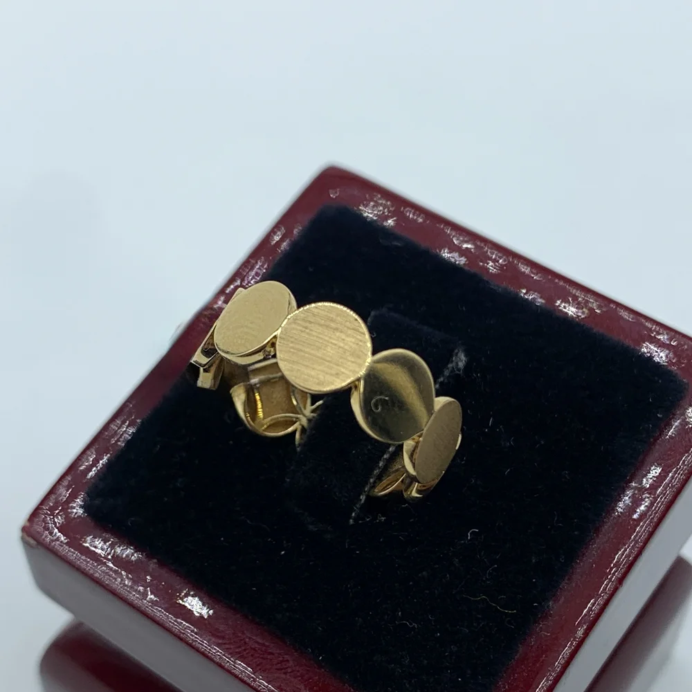 انگشتر دیسکی، نمایانگر کمال در طراحیهای مینیمال و هندسی است. این سبک از جواهرات با کنار گذاشتن پیچیدگیها، تمرکز خود را بر فرمهای خالص و ساده میگذارد. همانطور که در تصویر پیداست، این انگشتر از تکرار منظم پلاکهای کوچک و مسطح دایرهای (دیسک) تشکیل شده است که یک حلقه چشمنواز را به وجود آوردهاند.