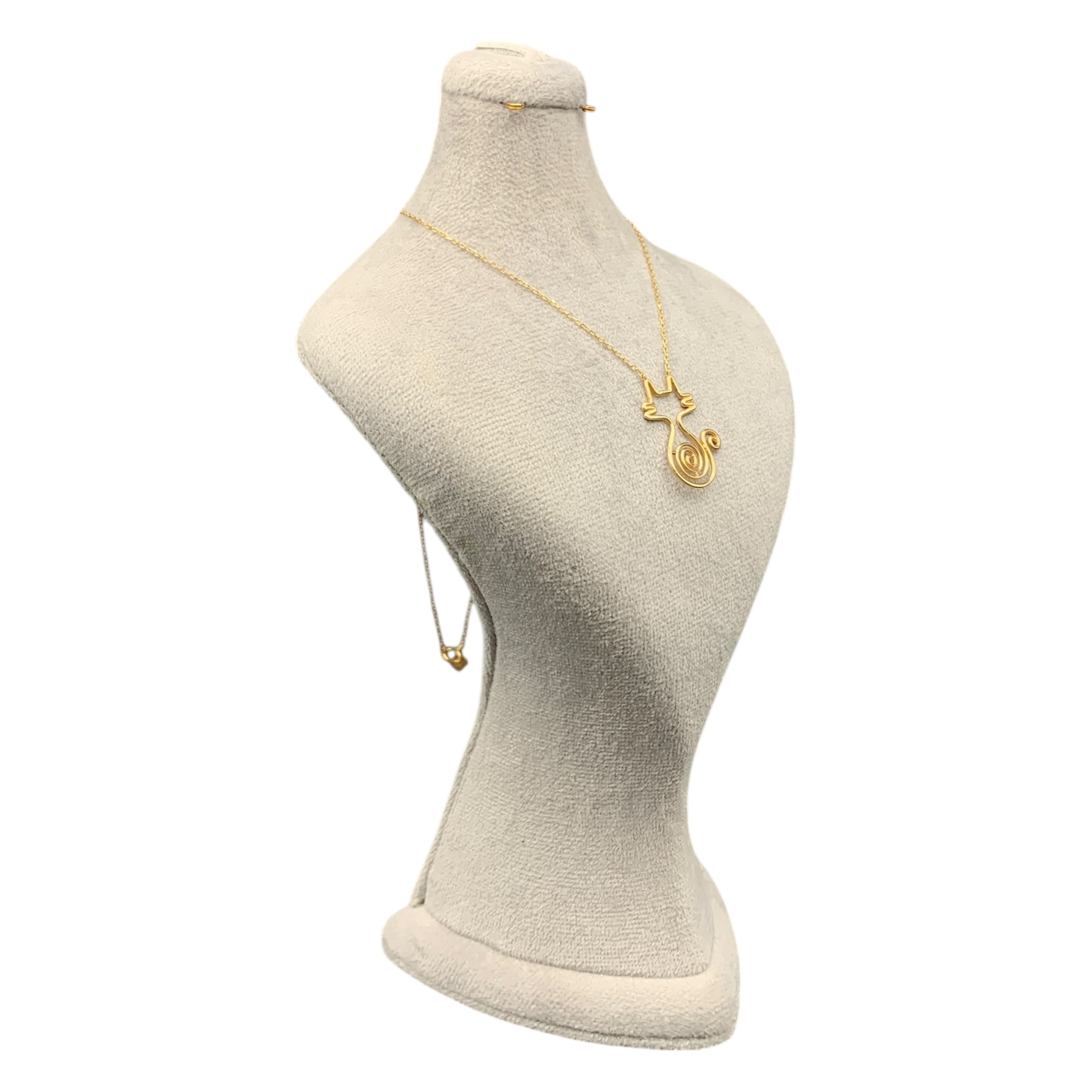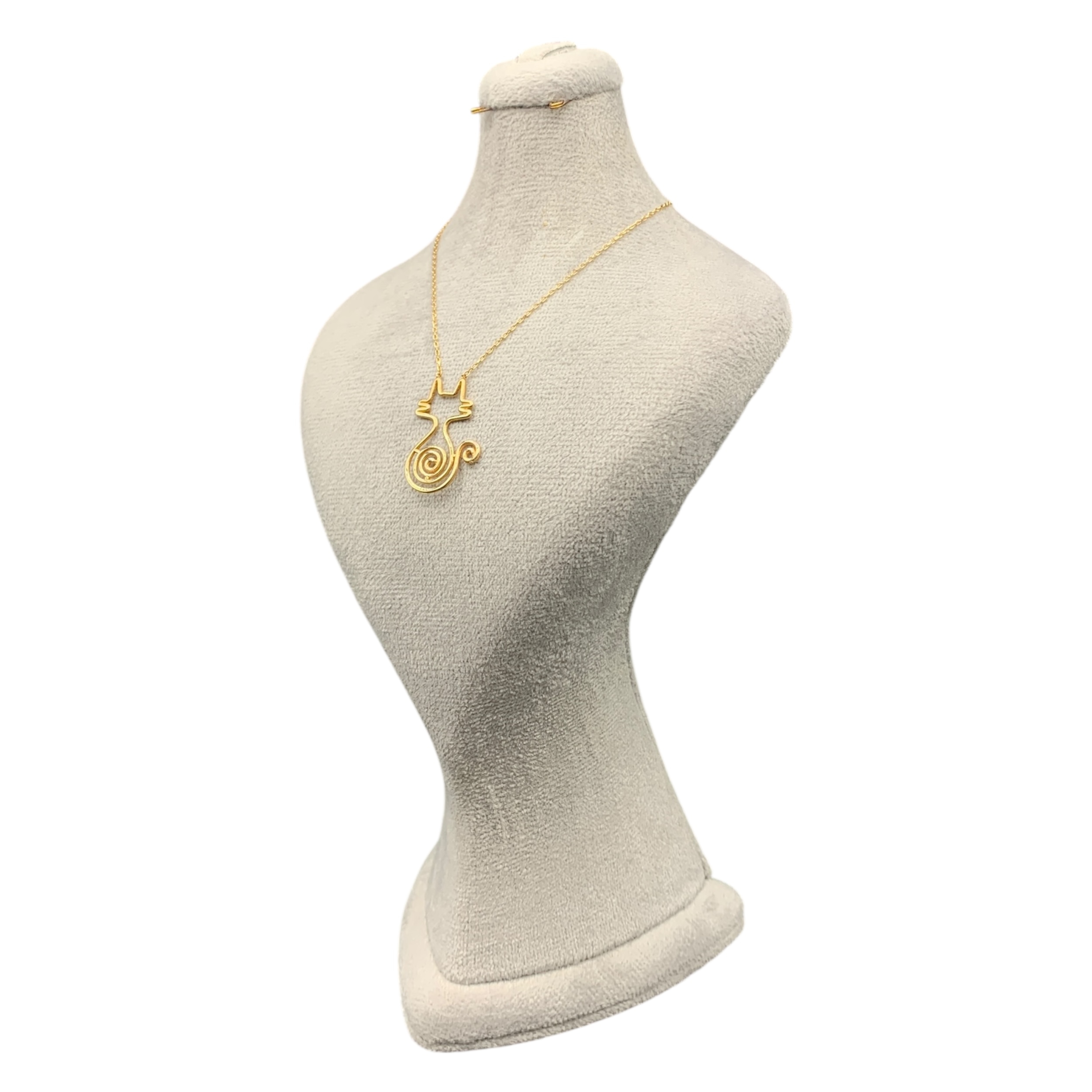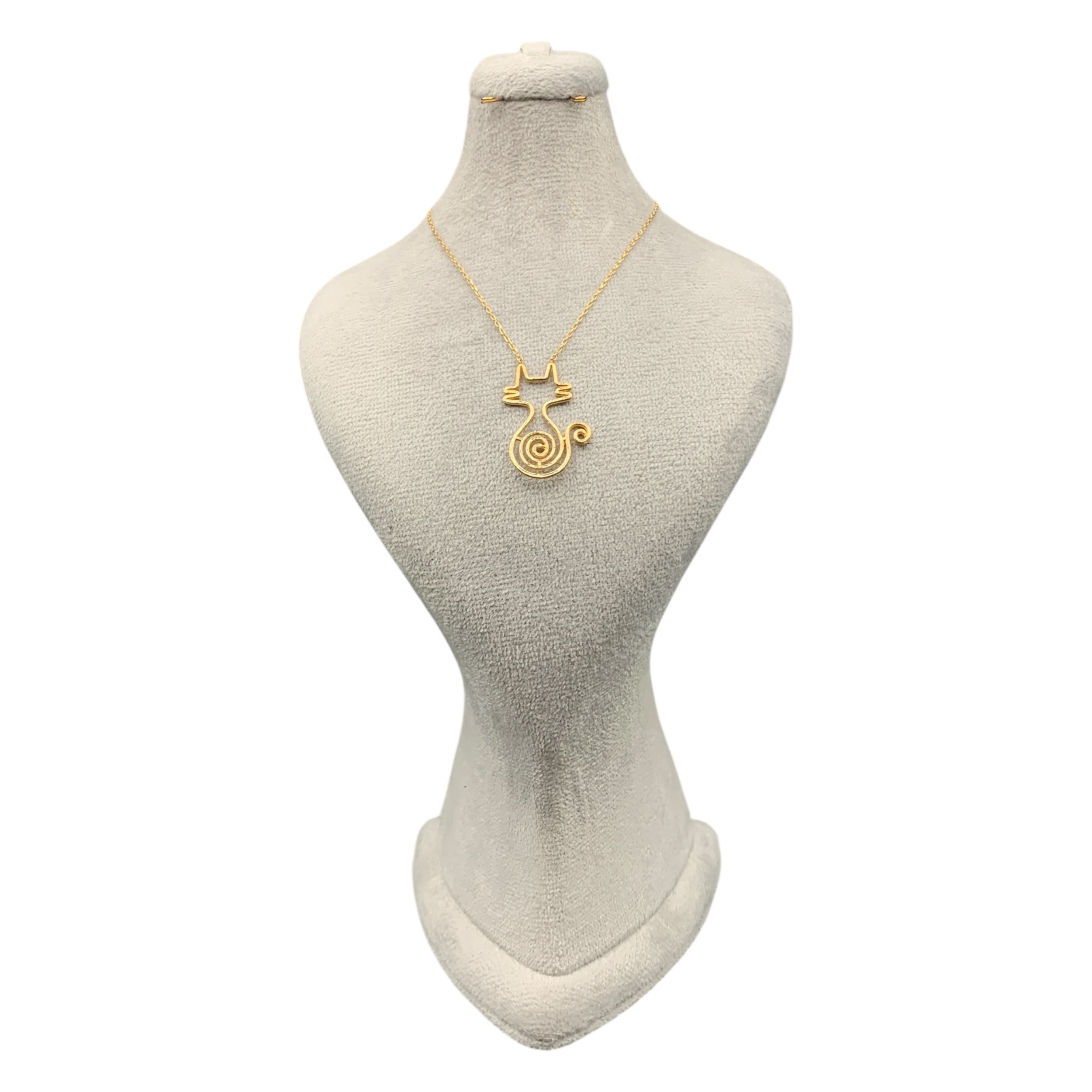 آویز گربه با خطوط مارپیچی و طراحی مینیمال ساخته شده تا در کنار زنجیر ظریف طلایی، جلوهای چشمگیر و خاص برای استایل روزمره یا مهمانی ایجاد کند.