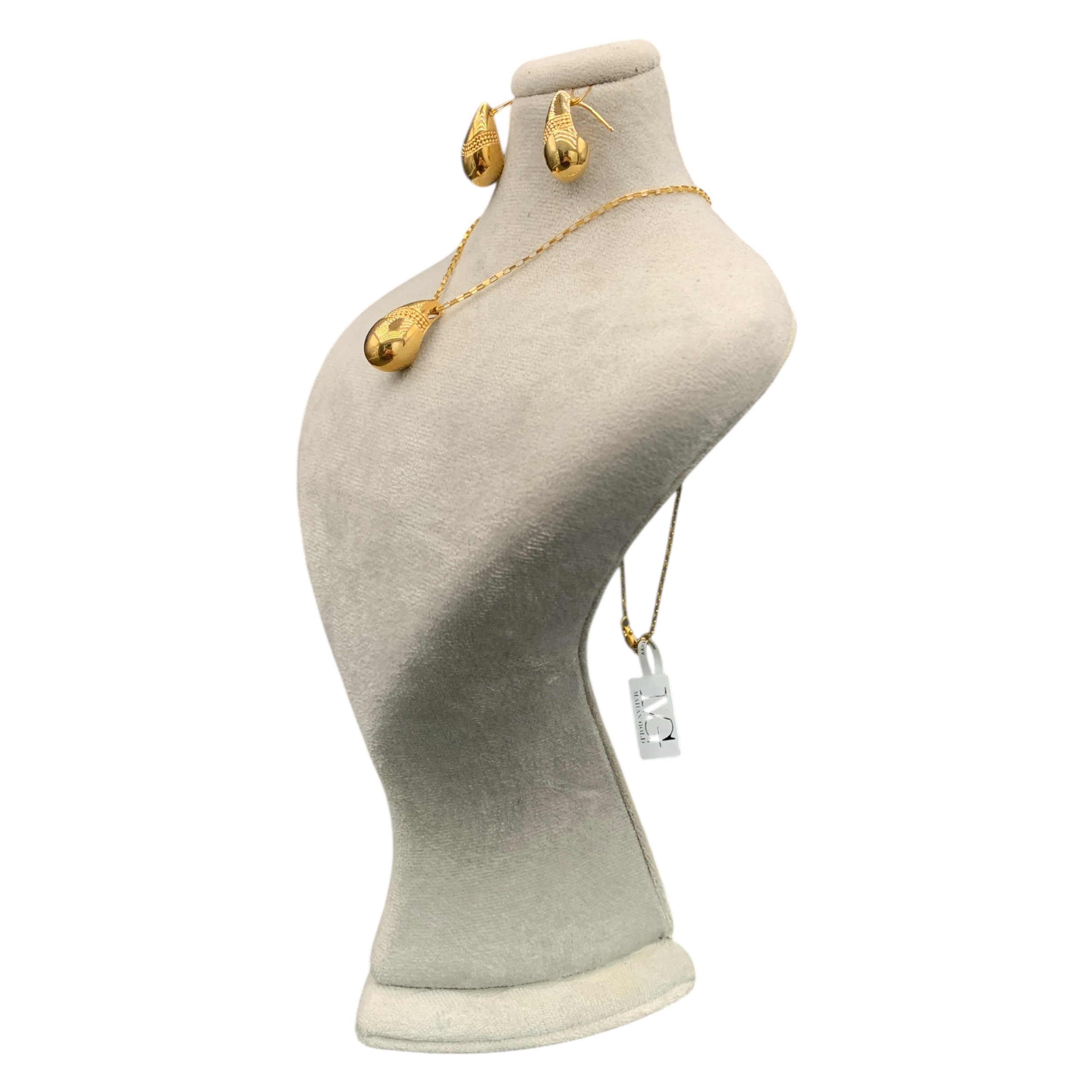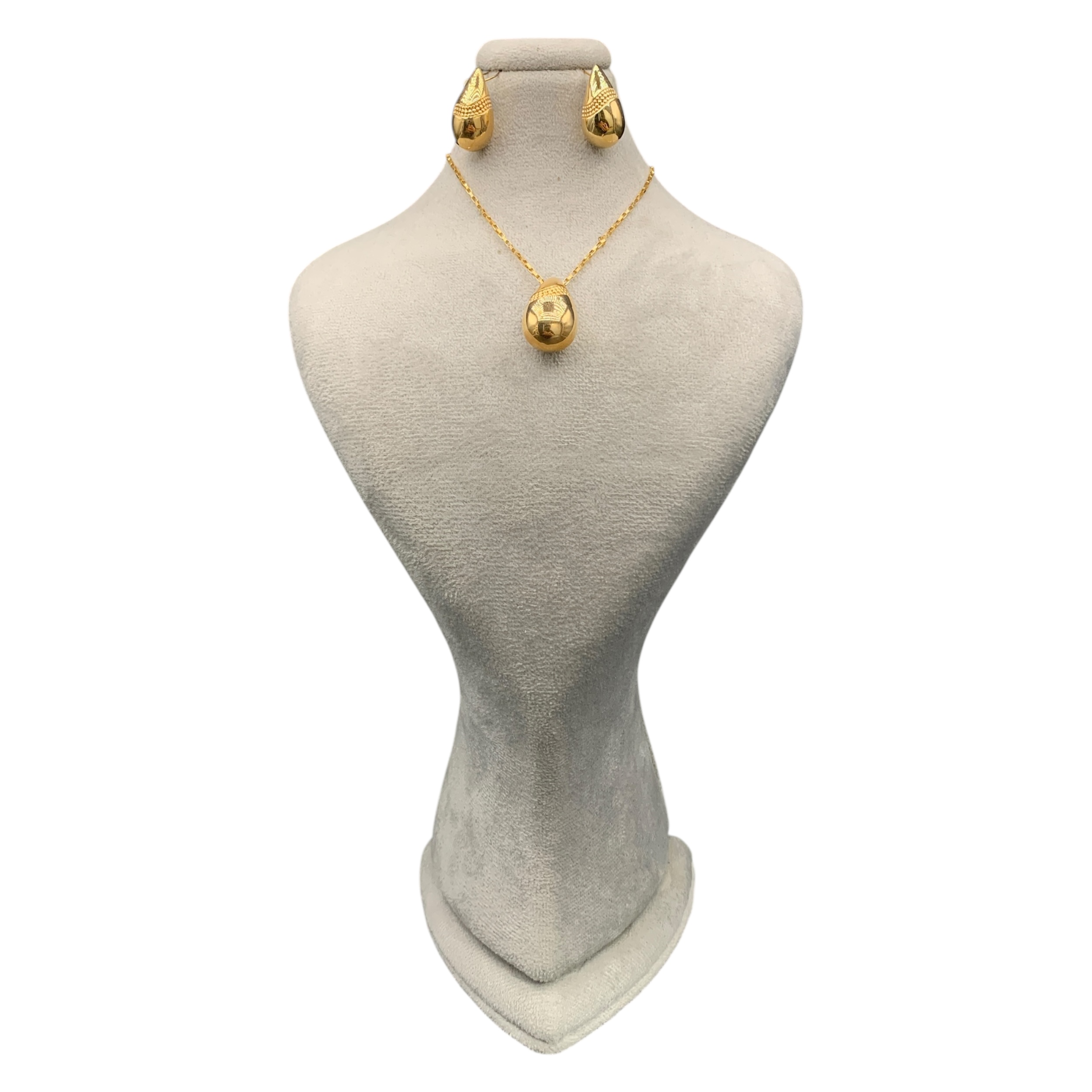 این مدل شامل گردنبندی با آویز توپ هندسی و دو گوشوارهی طلایی طرح اشک است که ترکیب آنها حس مجلل و فاخر ایجاد میکند.