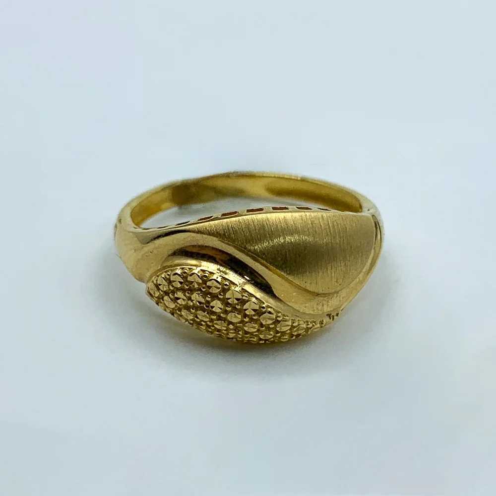 نگشتر «لمس زرین» تجسمی از هنر و نوآوری در طراحی طلاست. این قطعه خیرهکننده، با ترکیبی هوشمندانه از دو بافت متمایز، زیبایی متفاوتی را به نمایش میگذارد. بخش منحنی و صیقلی انگشتر، با درخشش ساتنی و ملایم خود، حسی از لطافت و تجمل را القا میکند. در کنار آن، بخش بافتدار و دانهای، مانند موجی از شنهای طلایی، عمق و جذابیت بصری به طرح میبخشد.