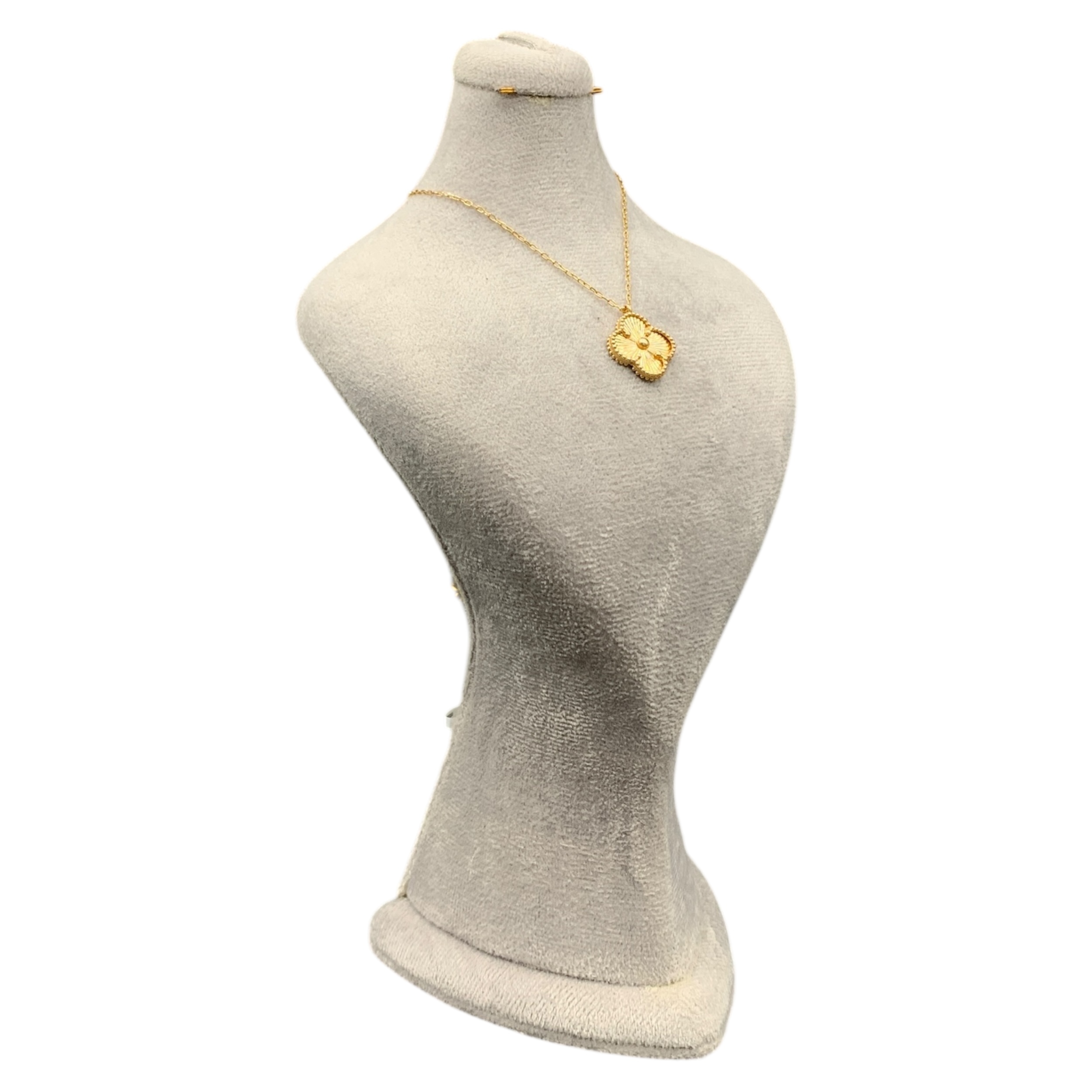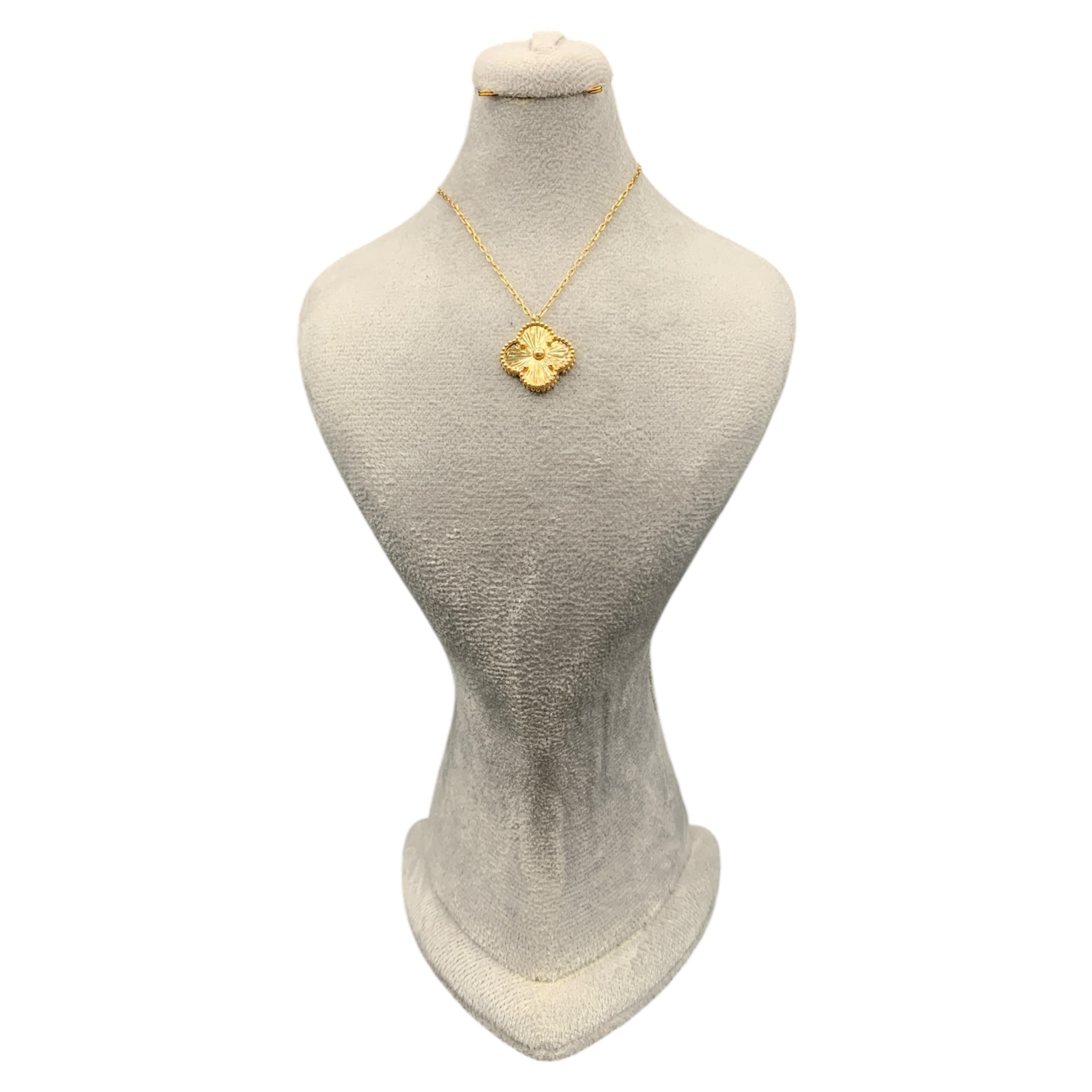 این گردنبند با آویز گل چهارپر ظریف و سطح موجدار طلایی، جلوهای خیرهکننده و ظریف دارد که مناسب استفاده روزانه یا مهمانیهای خاص است.