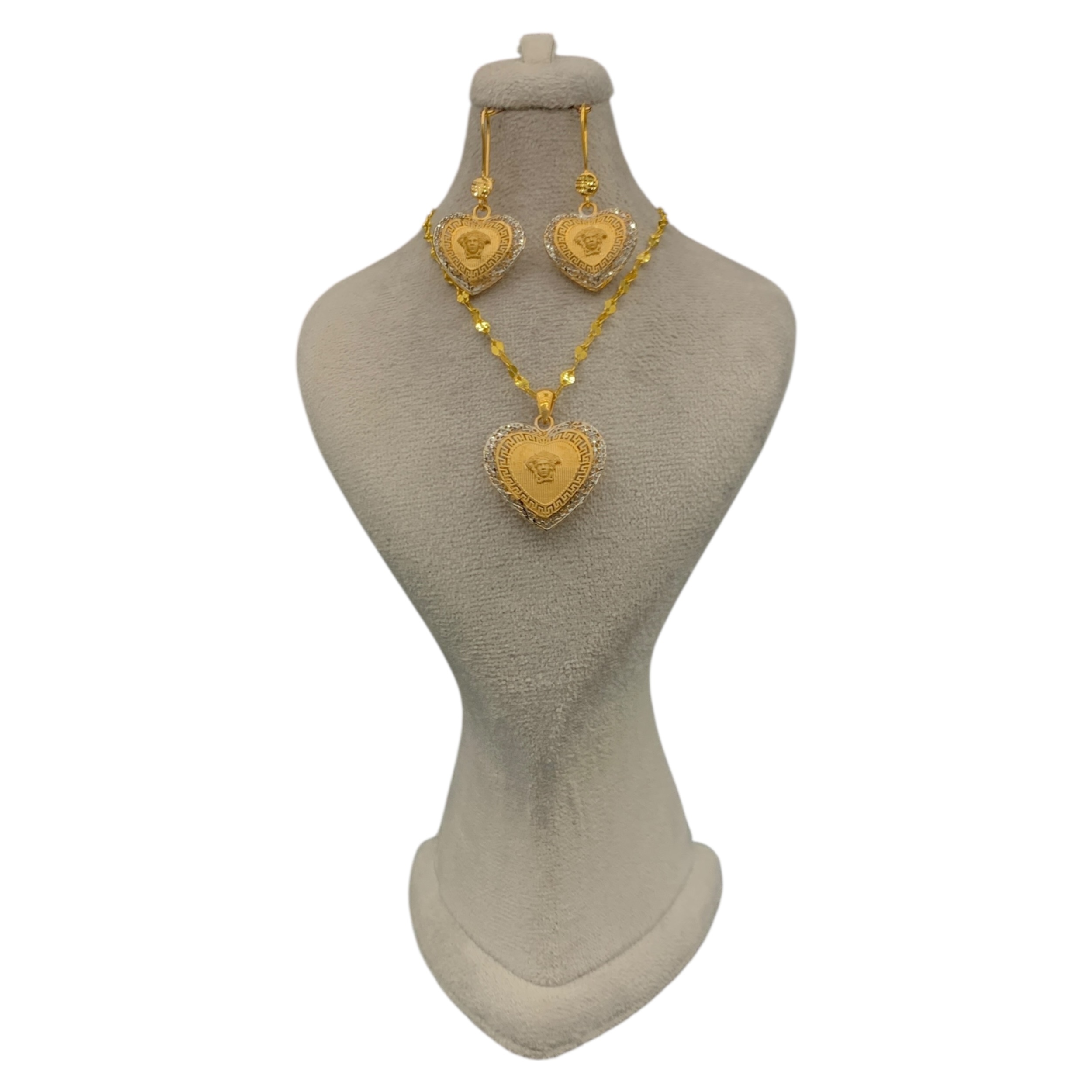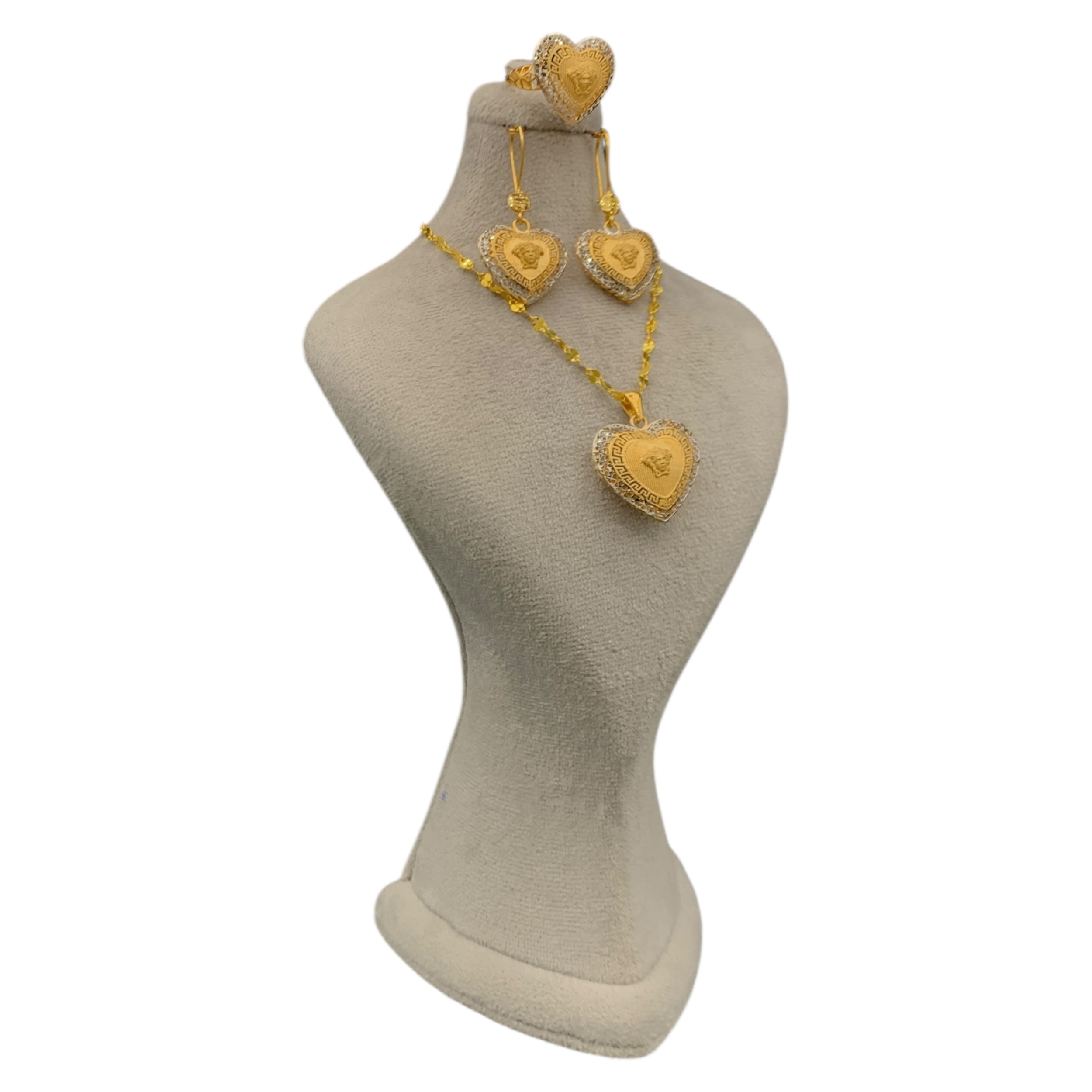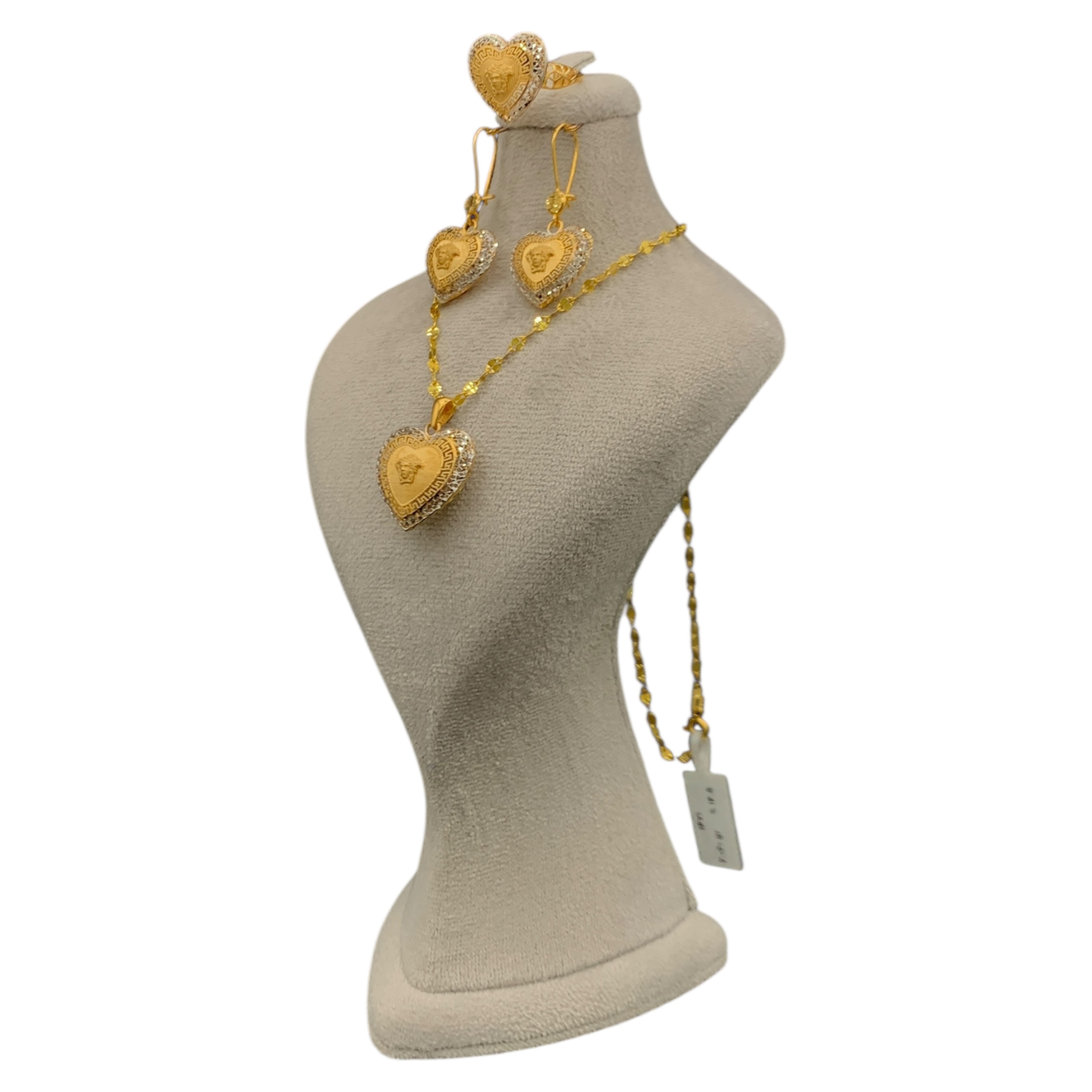 نیمست قلبی ورساچه با طراحی برجسته قلب و نشان مدوسا، شامل گردنبند، گوشواره و انگشتر؛ مناسب استایلهای مجلسی و خاص.