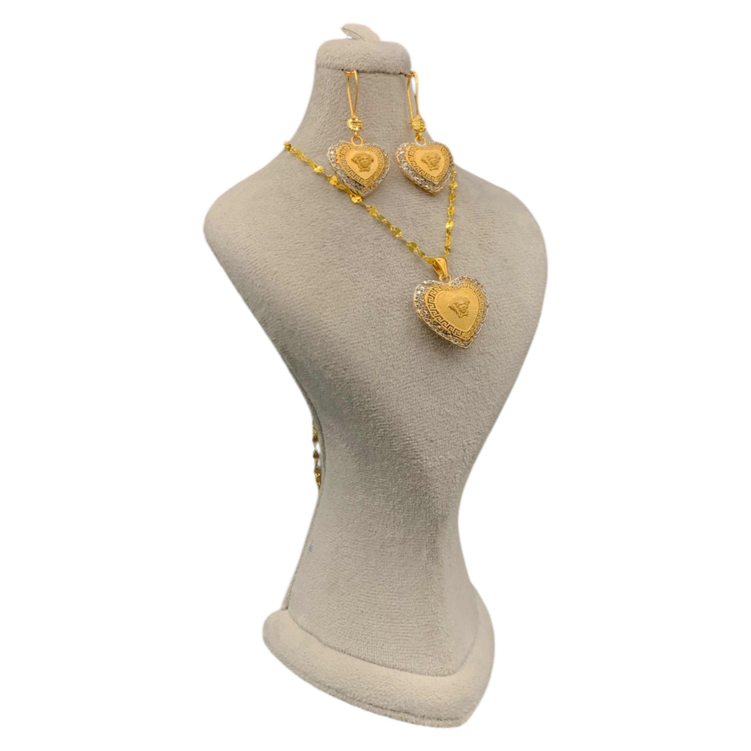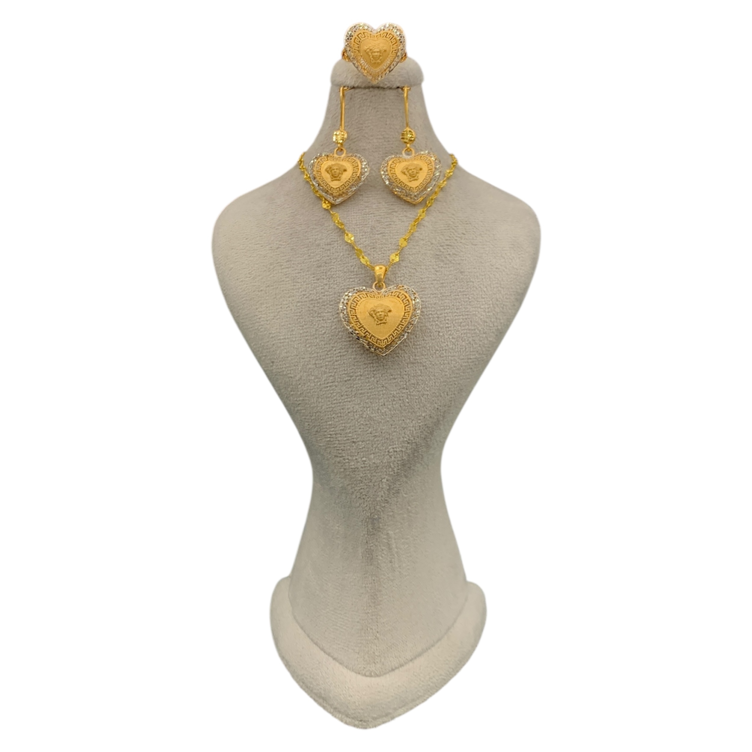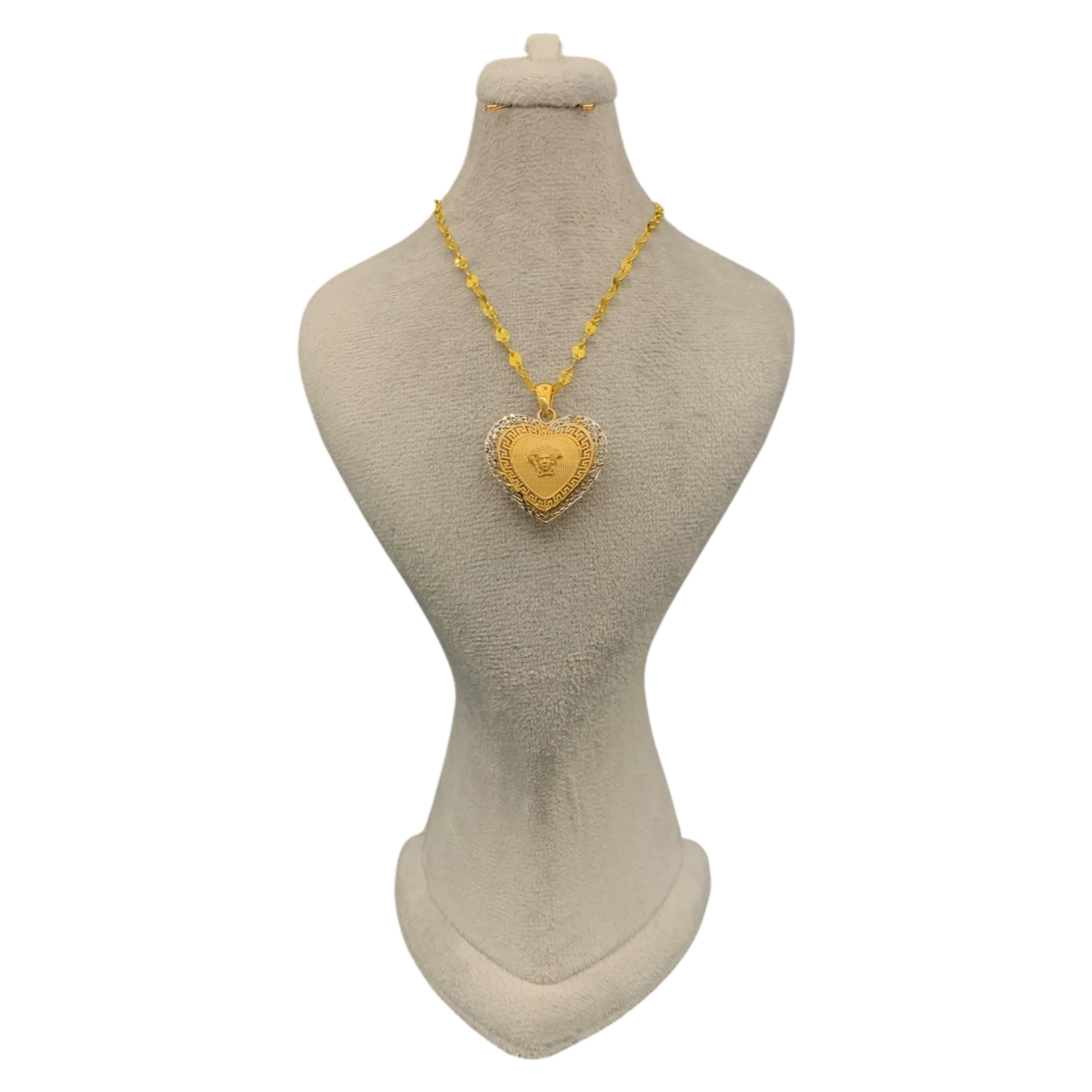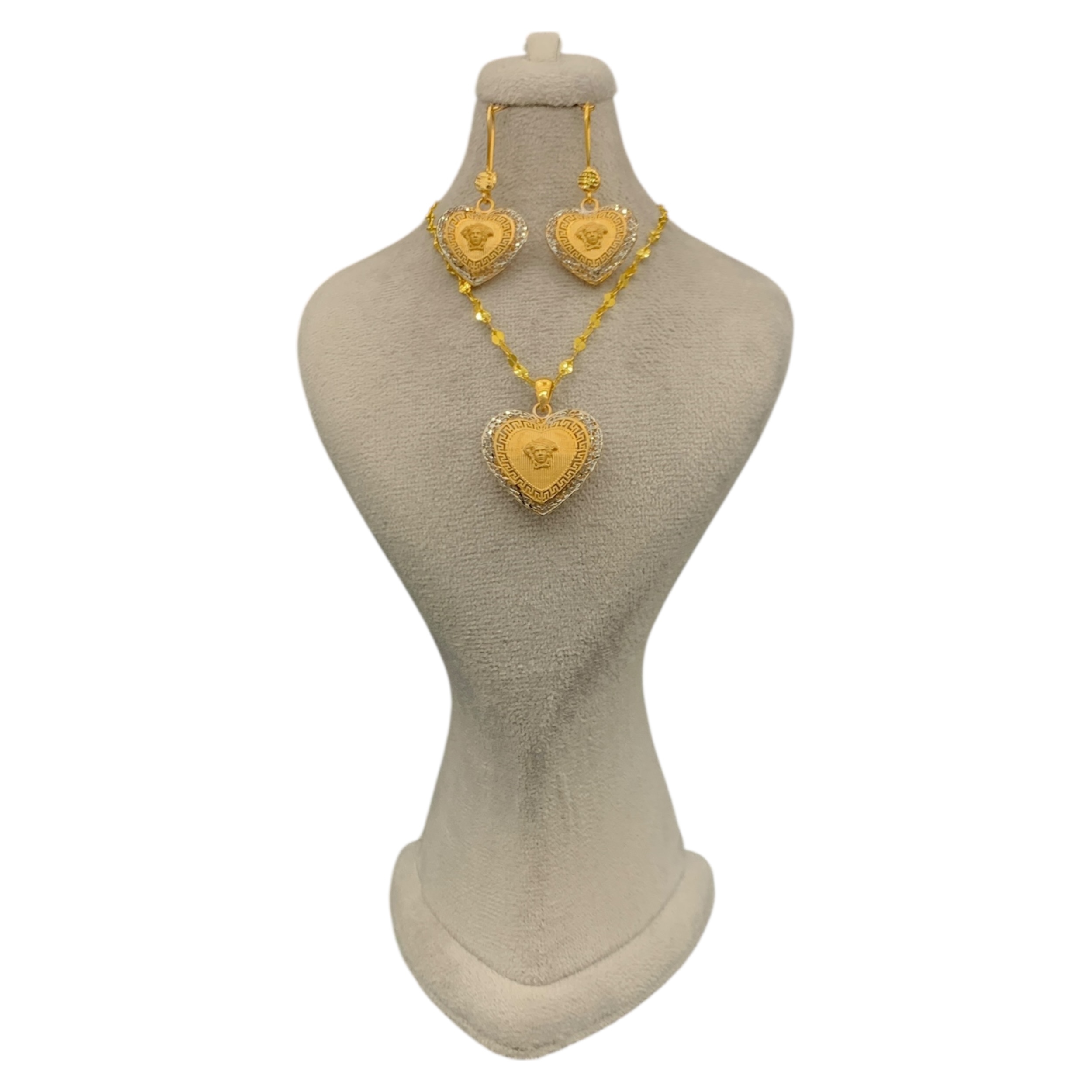 نیمست قلبی ورساچه با طراحی برجسته قلب و نشان مدوسا، شامل گردنبند، گوشواره و انگشتر؛ مناسب استایلهای مجلسی و خاص.