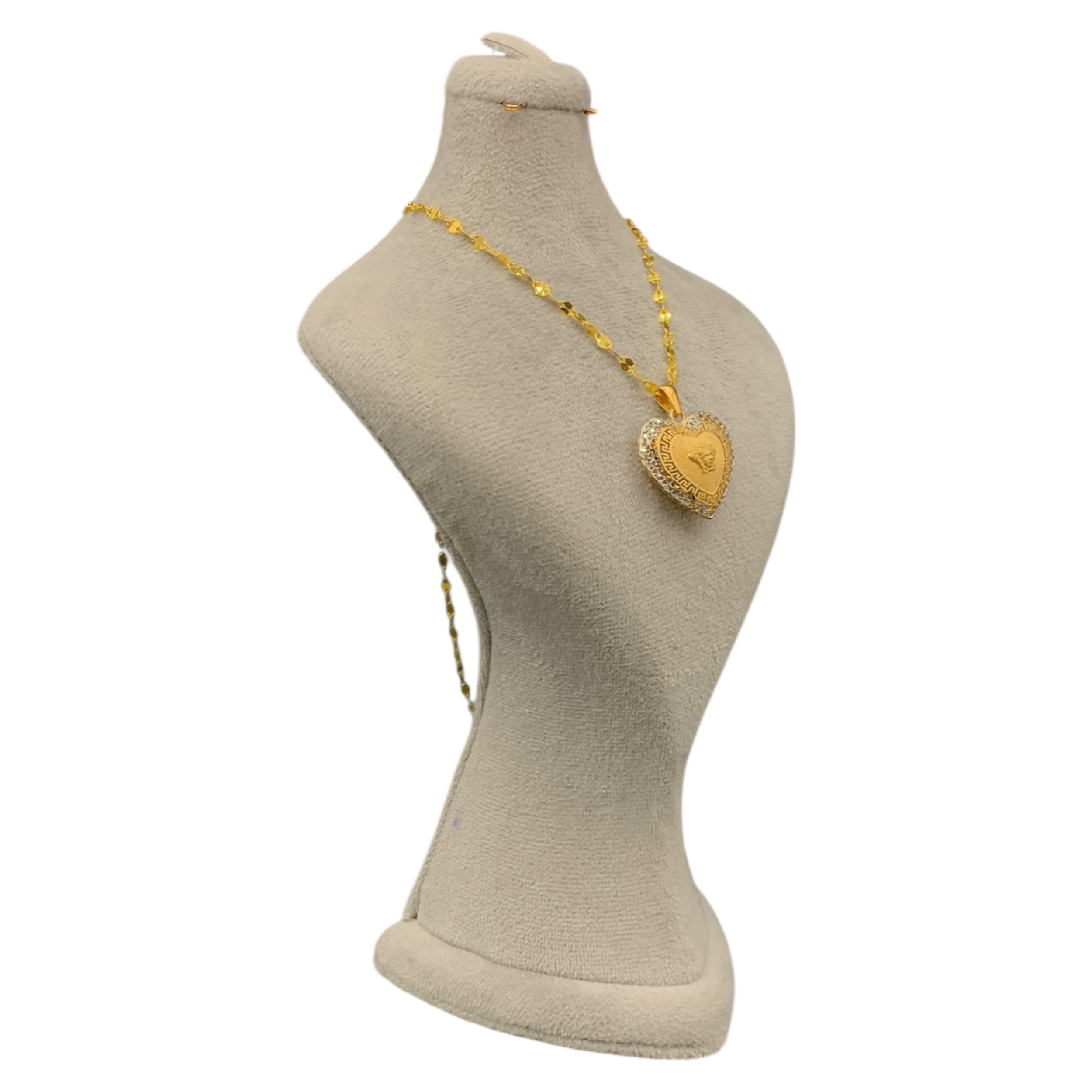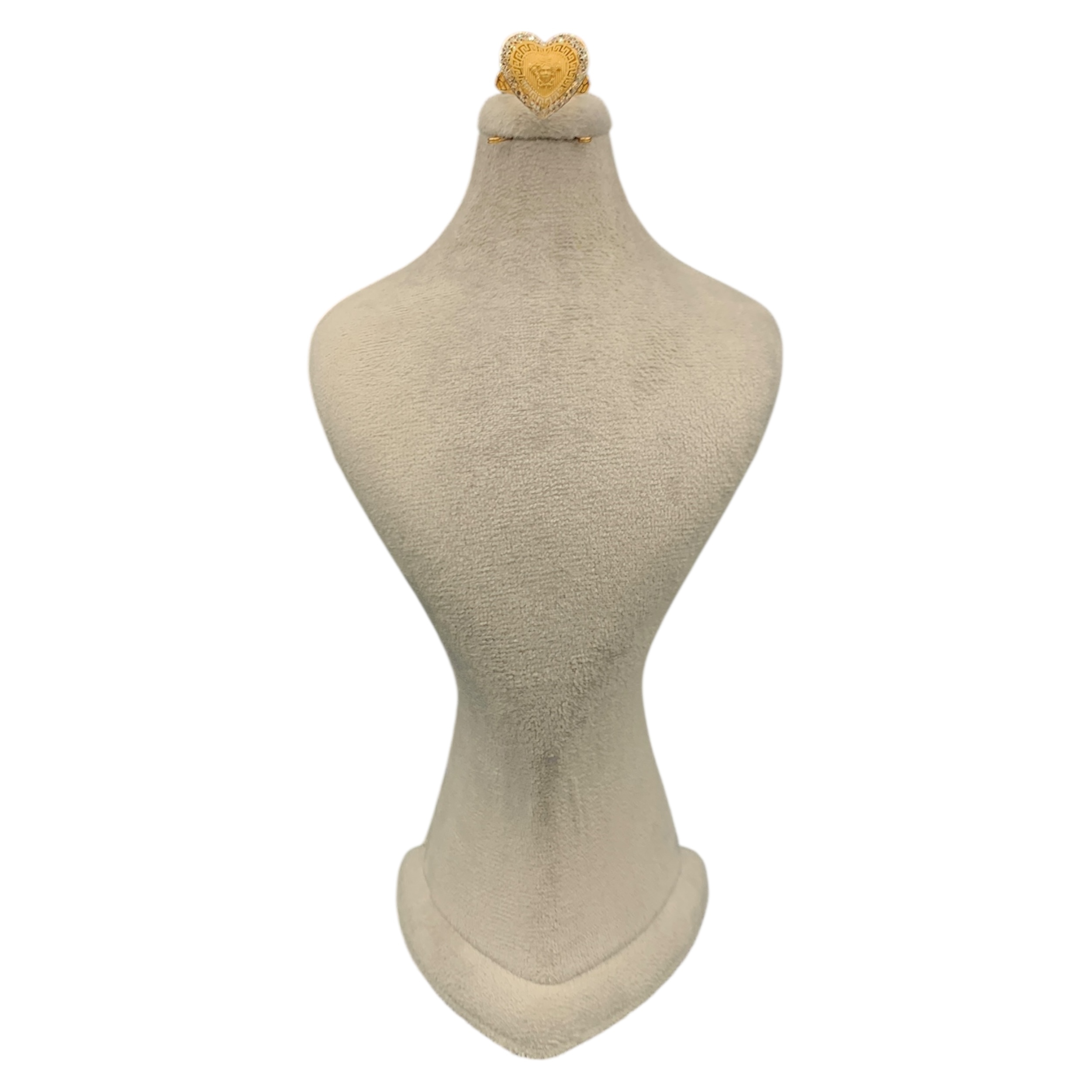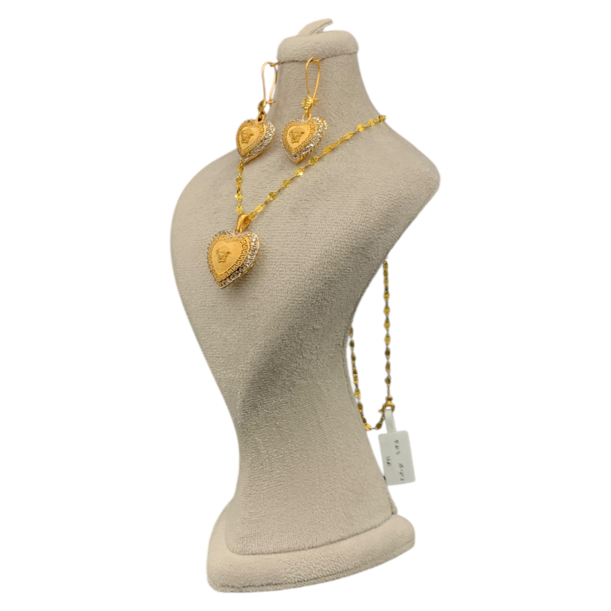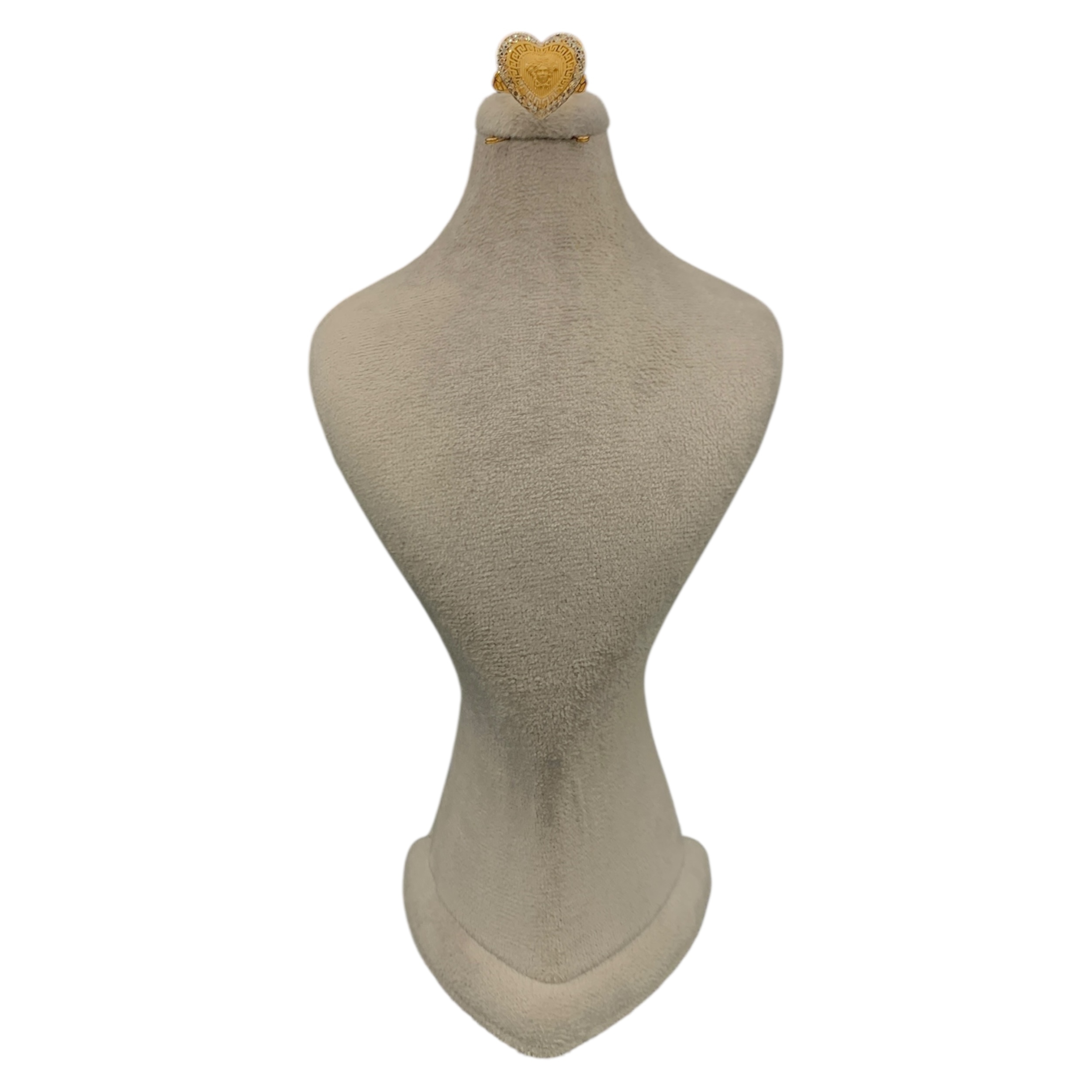 این نیمست قلبی طرح Versace Medusa یکی از خاصترین و جذابترین مدلهای طلایی است.طراحی قلبی با حاشیه برجسته و وسط آن نشان معروف ورساچه حک شده که جلوهای لاکچری، متفاوت و چشمگیر ایجاد میکند.گردنبند دارای زنجیر گویدار طلایی و یک مدال قلب بزرگ است. گوشوارهها نیز آویزدار و چشمنواز هستند و انگشتر قلبی ست، این نیمست را کامل میکند.این مدل یکی از پرفروشترین طرحهای لاکچری در بین جوانان است و برای هدیه و مراسم بسیار مناسب است.