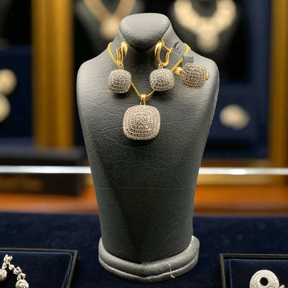 نیمست آوا، با طراحی مدرن و براق از طلای ۱۸ عیار، شامل آویز، گوشواره و انگشتر مربعی با تراشهای درخشان و بدون نگین است که جلوهای لوکس و مینیمال ایجاد میکند.