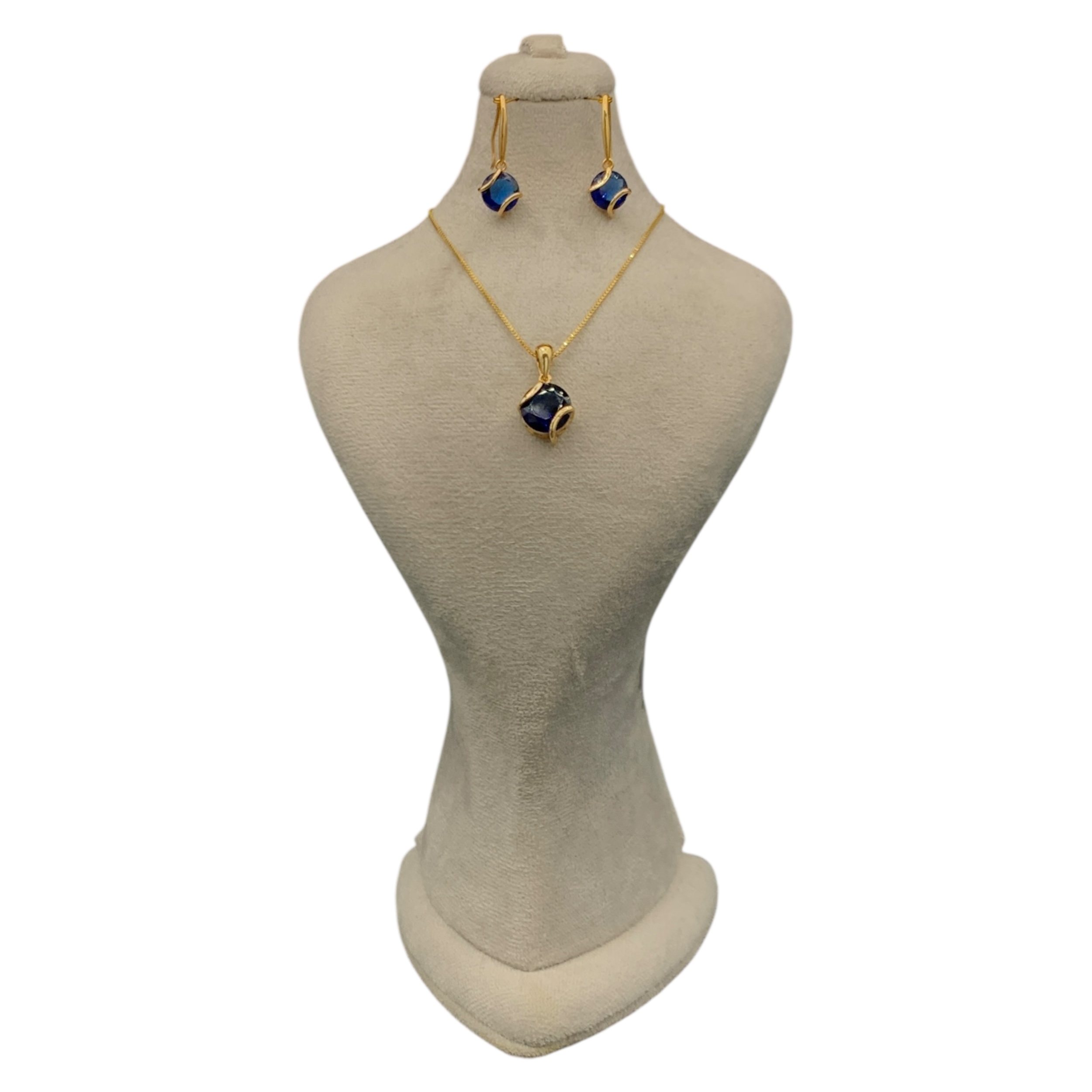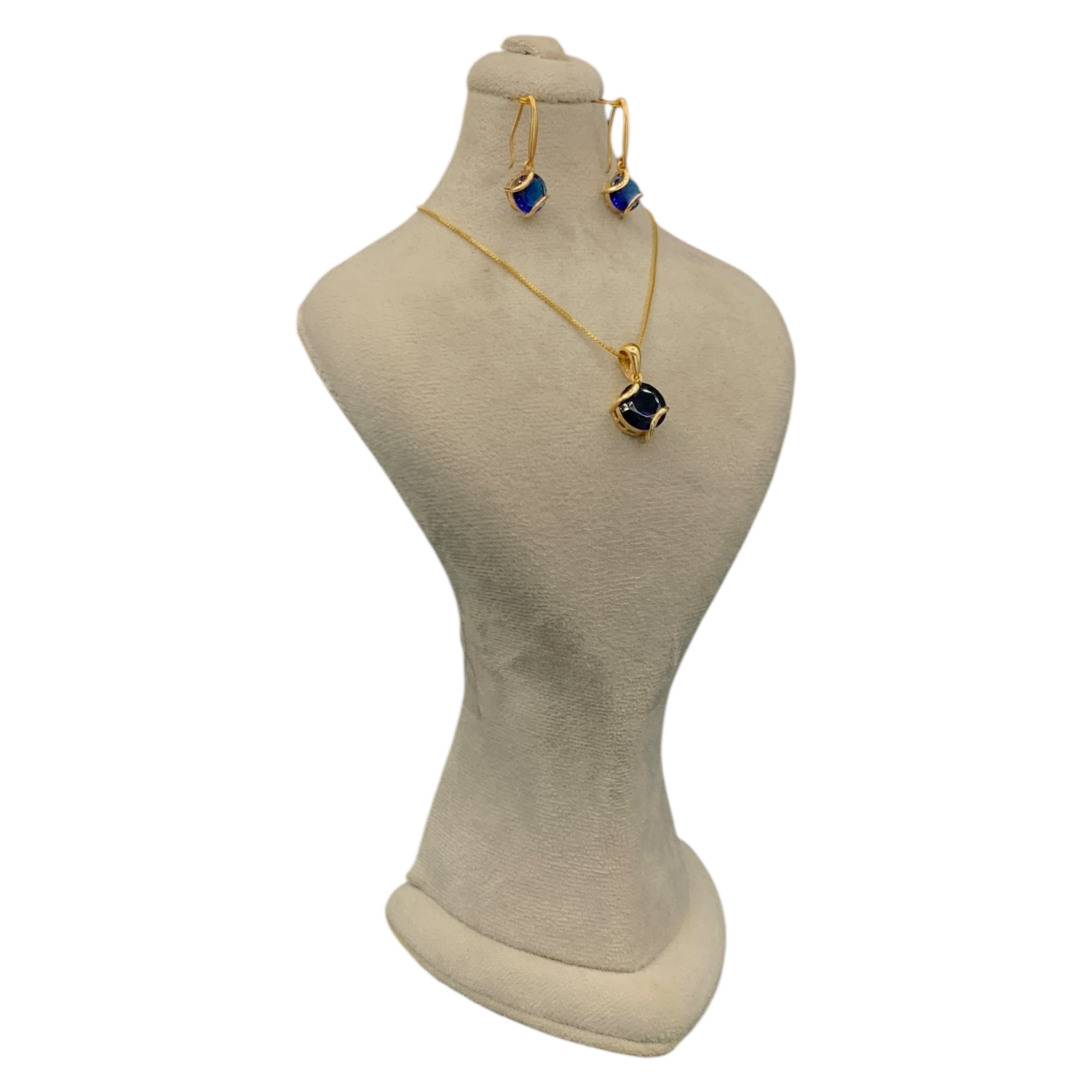 نیمست طلایی با سنگ کروی آبی درخشان، شامل گردنبند و گوشوارههای آویز؛ مناسب استایلهای شیک و مهمانی.