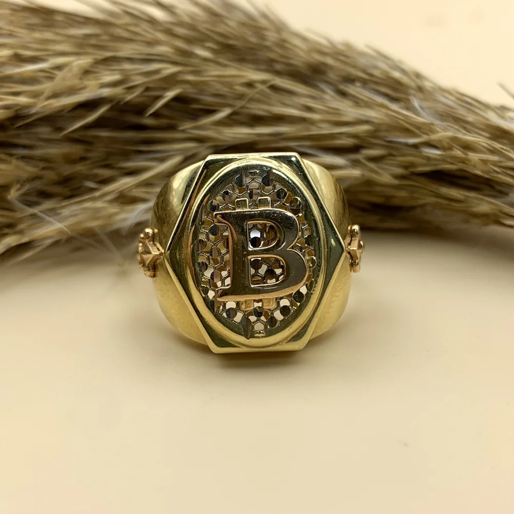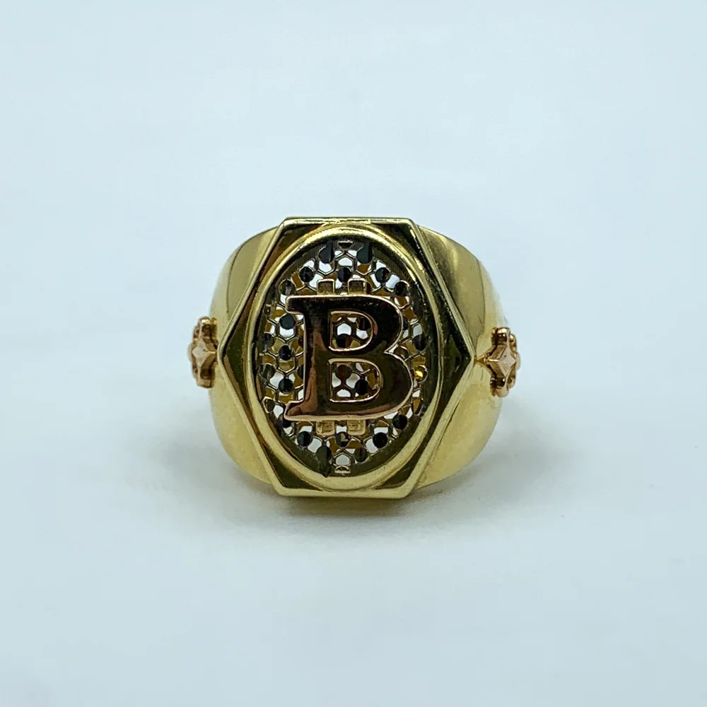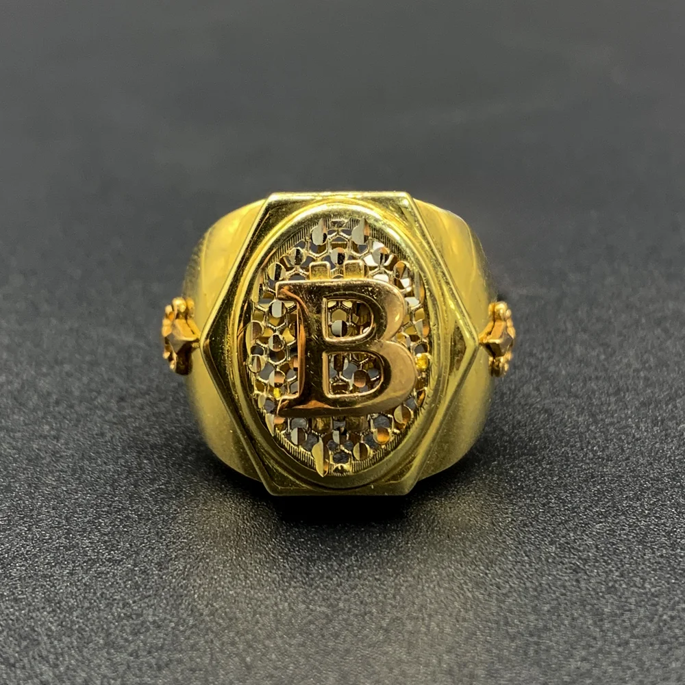 انگشتر «زرنگار B» تجلی ترکیب تجمل و هویت شخصی است. این انگشتر با یک قاب طلایی چندوجهی و یک صفحه مرکزی بیضیشکل، جلوهای شاهانه دارد. مرکز توجه این طرح، حرف B است که بهصورت برجسته و با دقت روی یک زمینه طلایی با تراشهای درخشان قرار گرفته است. این تراشها، نور را منعکس کرده و انگشتر را در هر زاویهای تابان و پرزرقوبرق نشان میدهند.