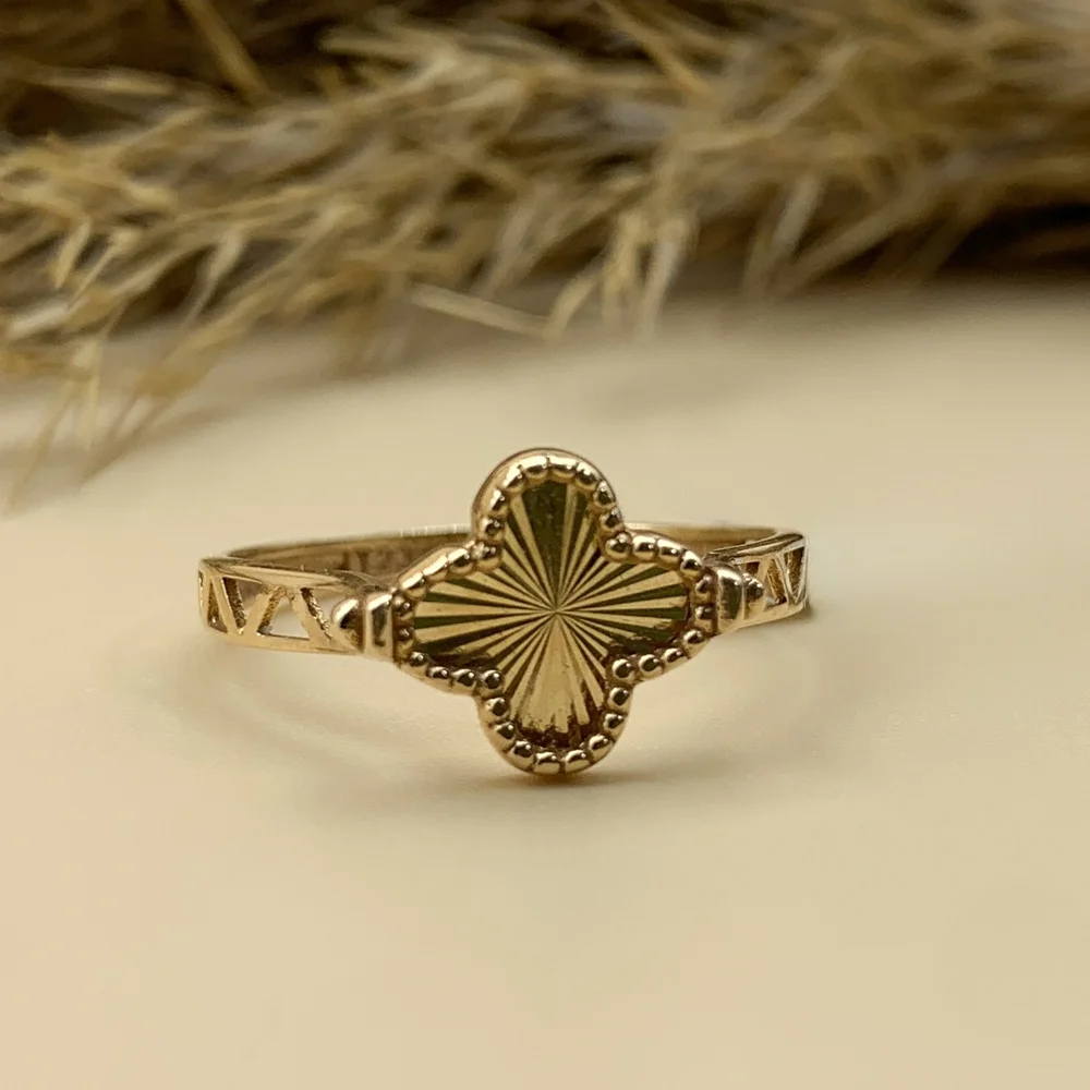 این انگشتر مینیمال ونکلیف، با الهام از نماد چهاربرگ شبدر (Alhambra) که نماد شانس و هارمونی است، طراحی ظریف و جاودانهای دارد. جنس طلای ۱۸ عیار آن با نقشهای ساده و درخشان، ترکیبی از لوکس بودن و سادگی را عرضه میکند و برای استفاده روزمره یا لحظات خاص، انتخابی شیک و ماندگار است.