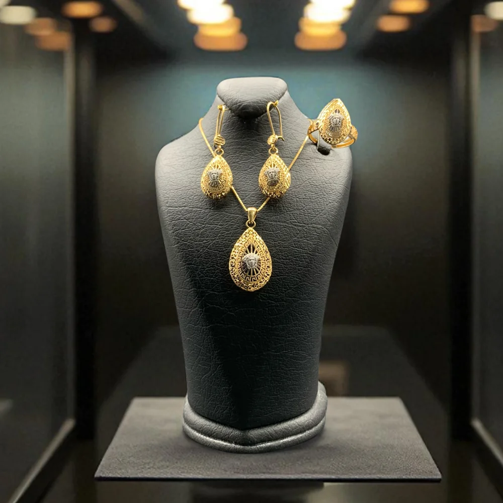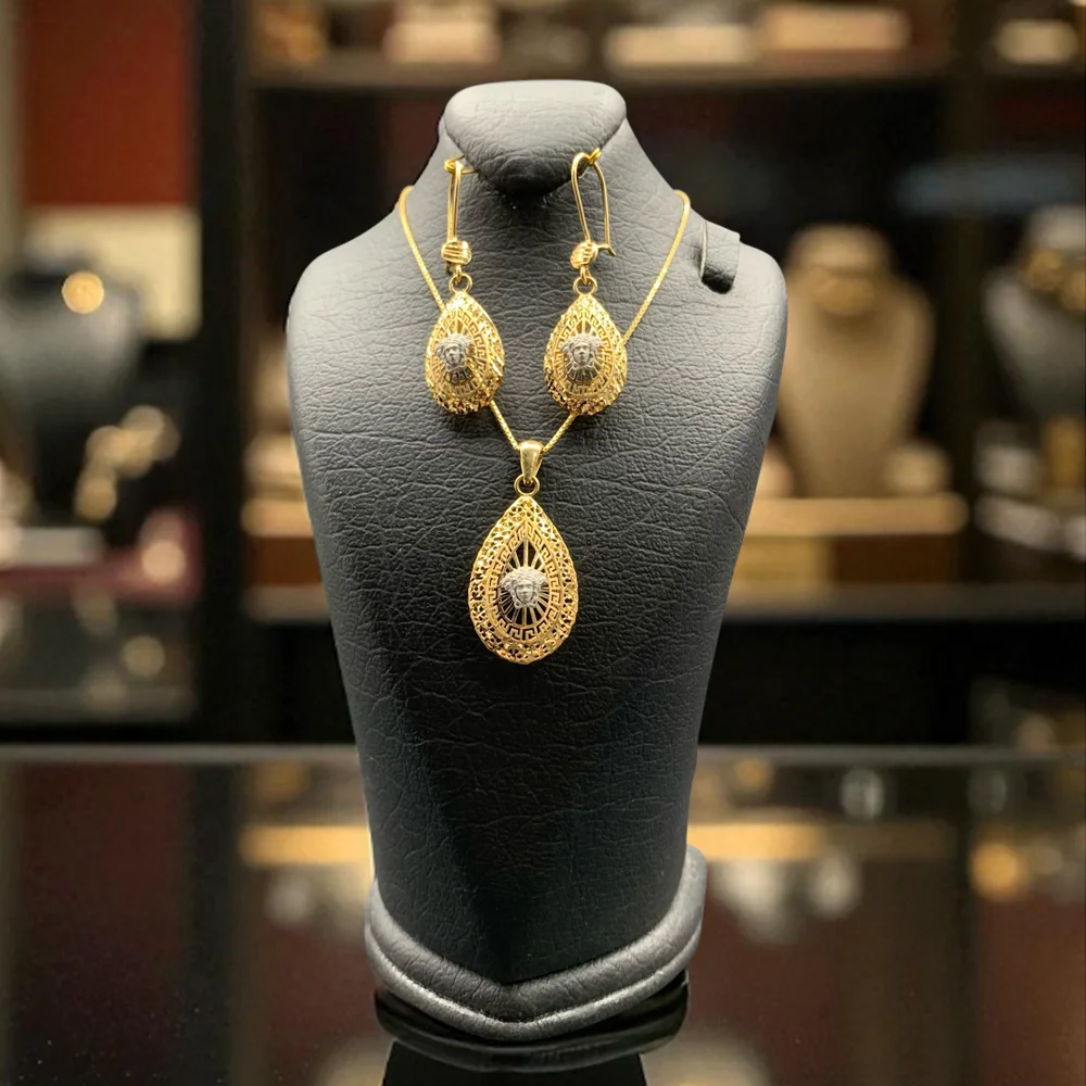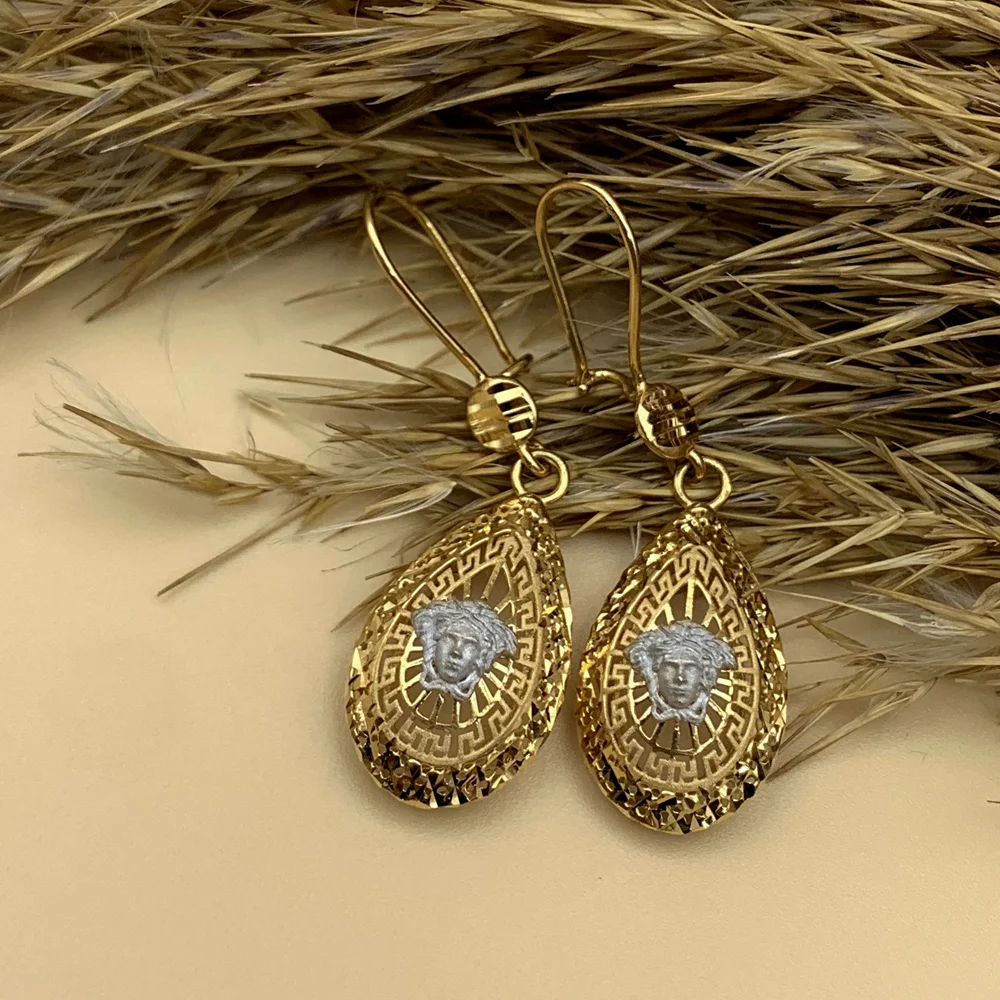 سرویس ورساچه با طراحی لوکس و الهامگرفته از اساطیر یونانی، شامل گردنبند، گوشواره و انگشتر از طلای ۱۸ عیار با آویزهای قطرهای مدوسا است که جلوهای کلاسیک و مدرن ایجاد میکند. این مجموعه بدون نگین، با بافتهای برجسته و قفل ایمن، نمادی از ظرافت برند ورساچه بوده و گزینهای ایدهآل برای مجالس خاص یا هدیهای باکیفیت بالا محسوب میشود.