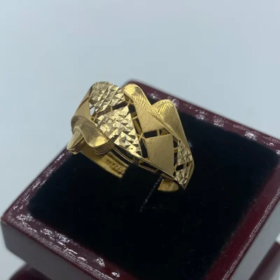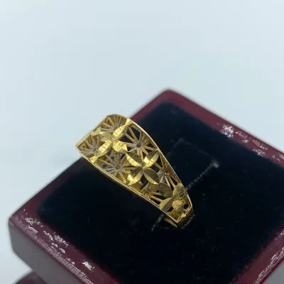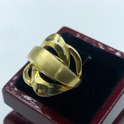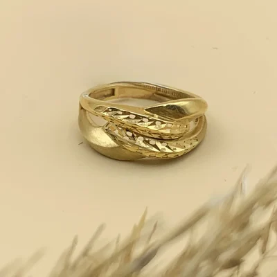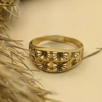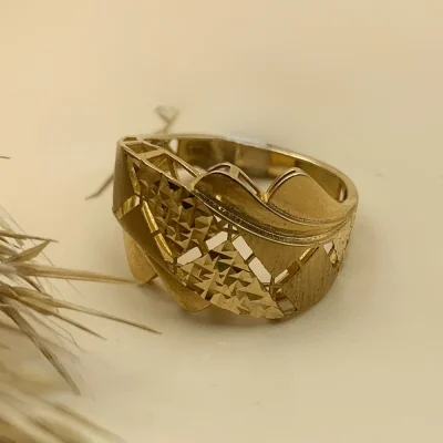انگشتر “خورشید خاموش” با طراحی ظریف و مواج طلایی، گویی نور ساکت سپیده‌دم را در خود نهان کرده است. این